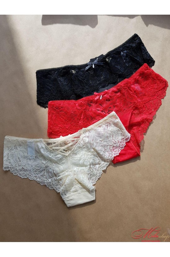Женские трусики-бразилиана из кружева и микрофибры. Сзади декорированы сексуальным вырезом со шнуровкой. Спереди украшены маленьким бантиком с бусинками. Хлопковая ластовица.