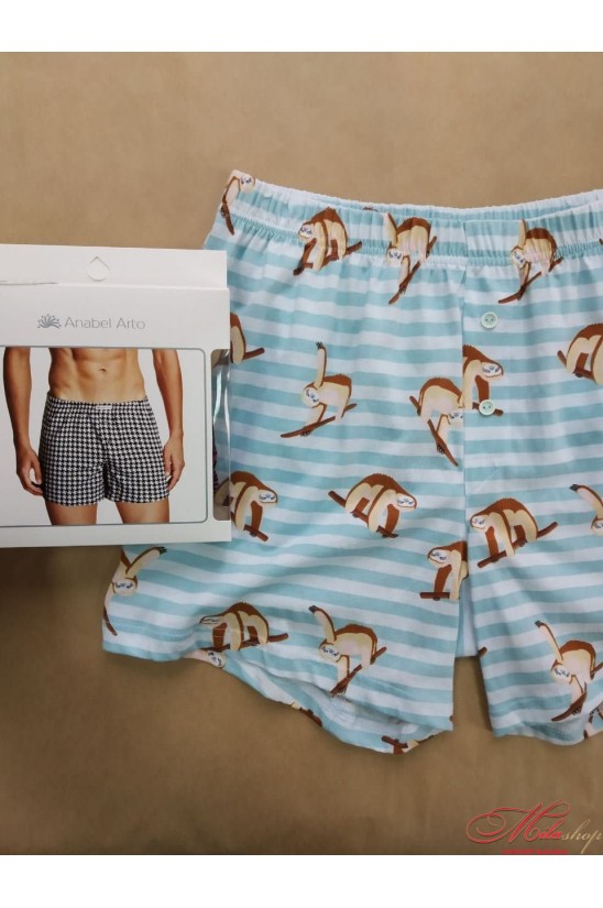 Мужские шорты-боксеры из принтованного хлопчатобумажного полотна. По среднему шву переда – отделочная строчка и две декоративные пуговицы. По верхнему краю трусов - эластичная резиновая тесьма.