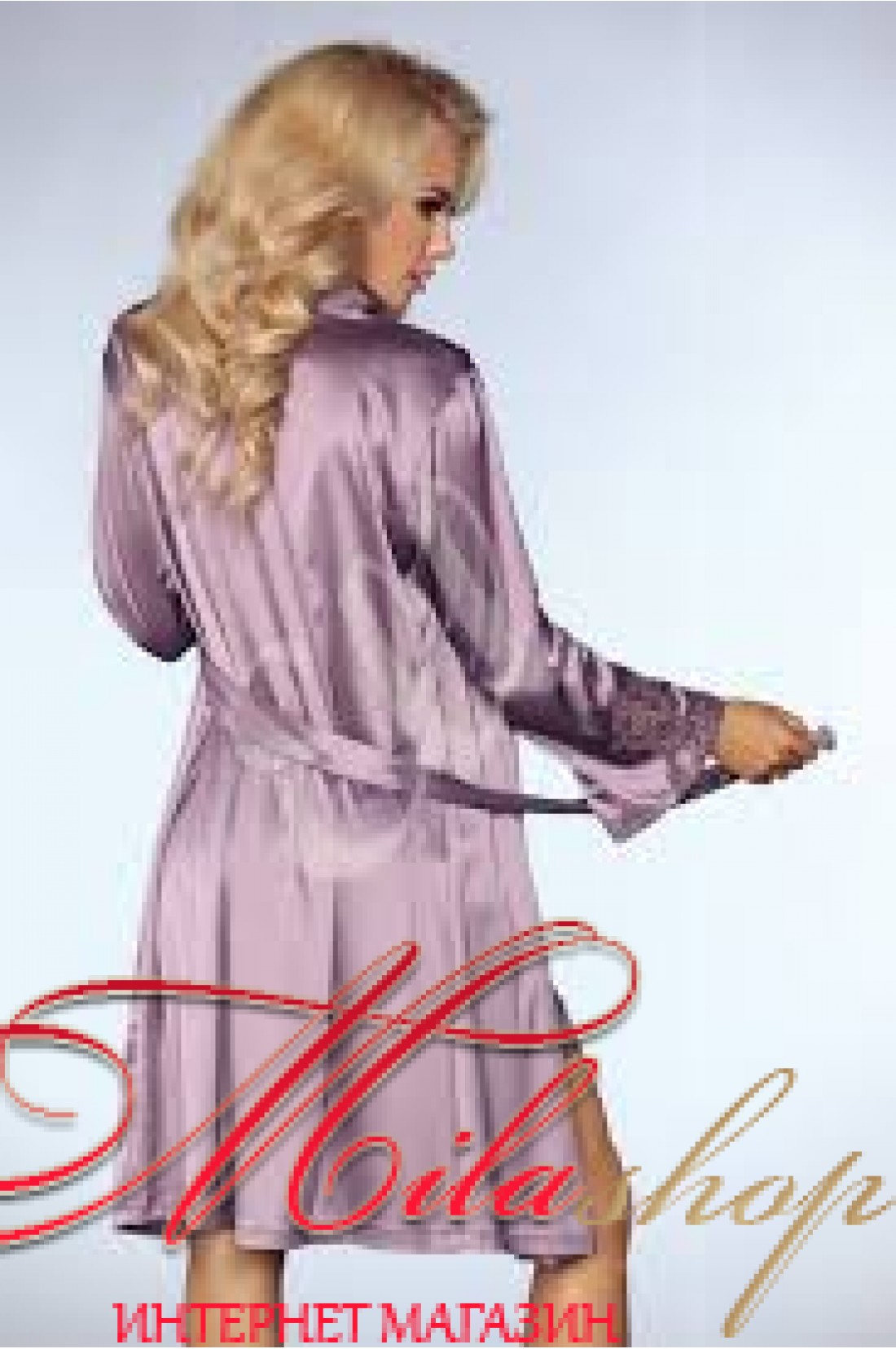 Изысканый халат длиной чуть выше колен на запах под поясок с длинными рукавами. На манжетах халатика - кружевные вставки с цветочными мотивами.