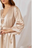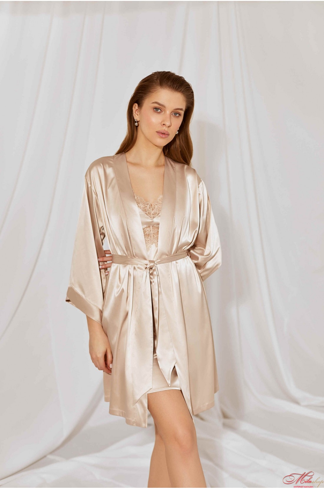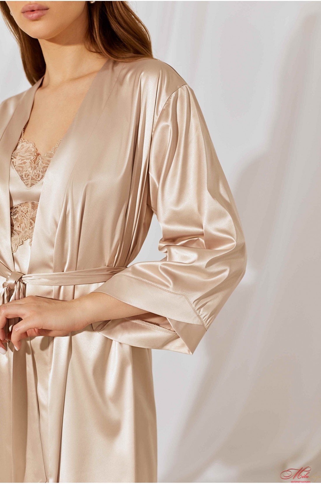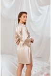Легкий халат із ніжного атласу з глянцевим блиском. Атласне полотно приємне до тіла, добре пропускає повітря, створює ефект прохолоди на тілі. Крій на запах дозволяє регулювати посадку по фігурі, прямі укорочені рукави. Зав'язується на талії поясом.