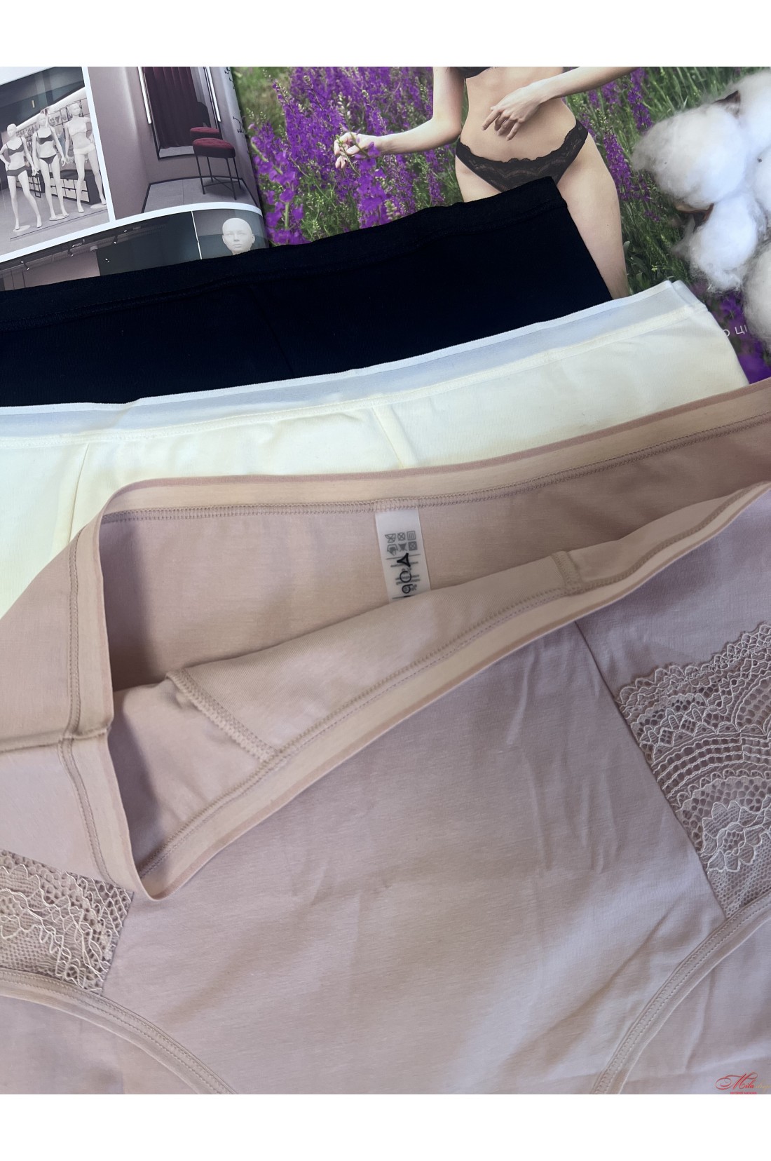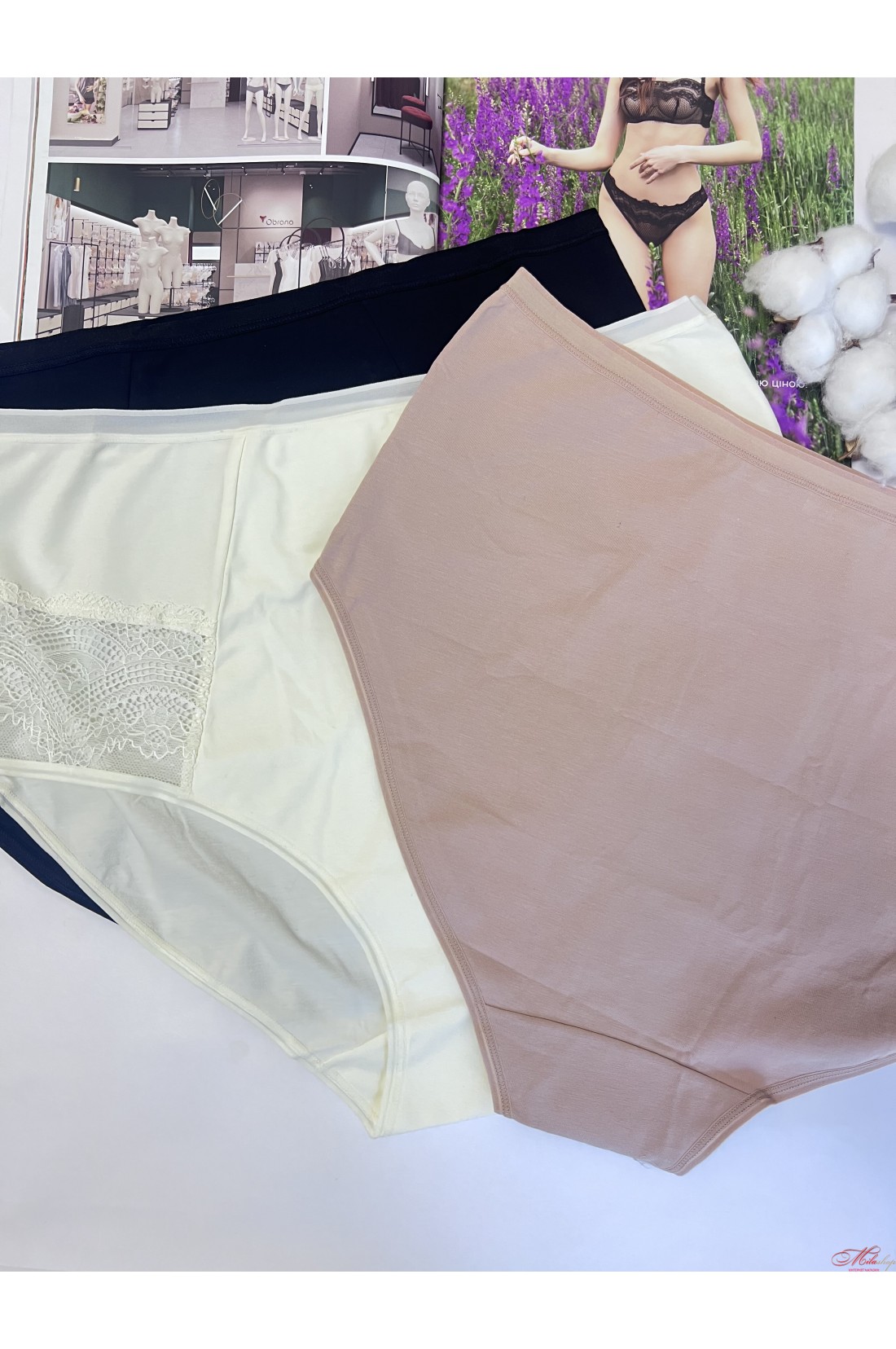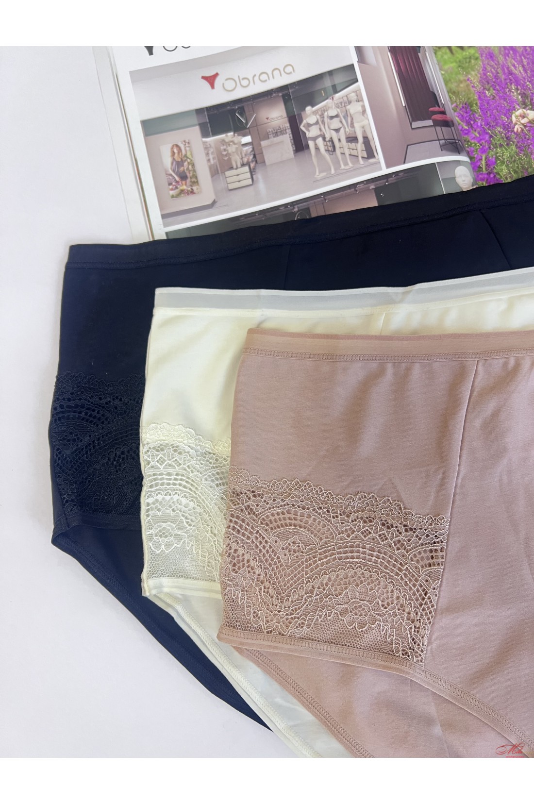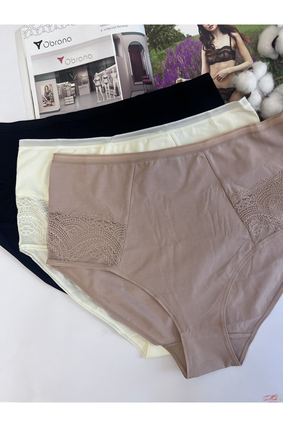 Трусики Obrana виконані з бавовняного полотна із вставками із гарного мережива. Висока лінія талії. Дуже комфортні м'які плоскі шви.