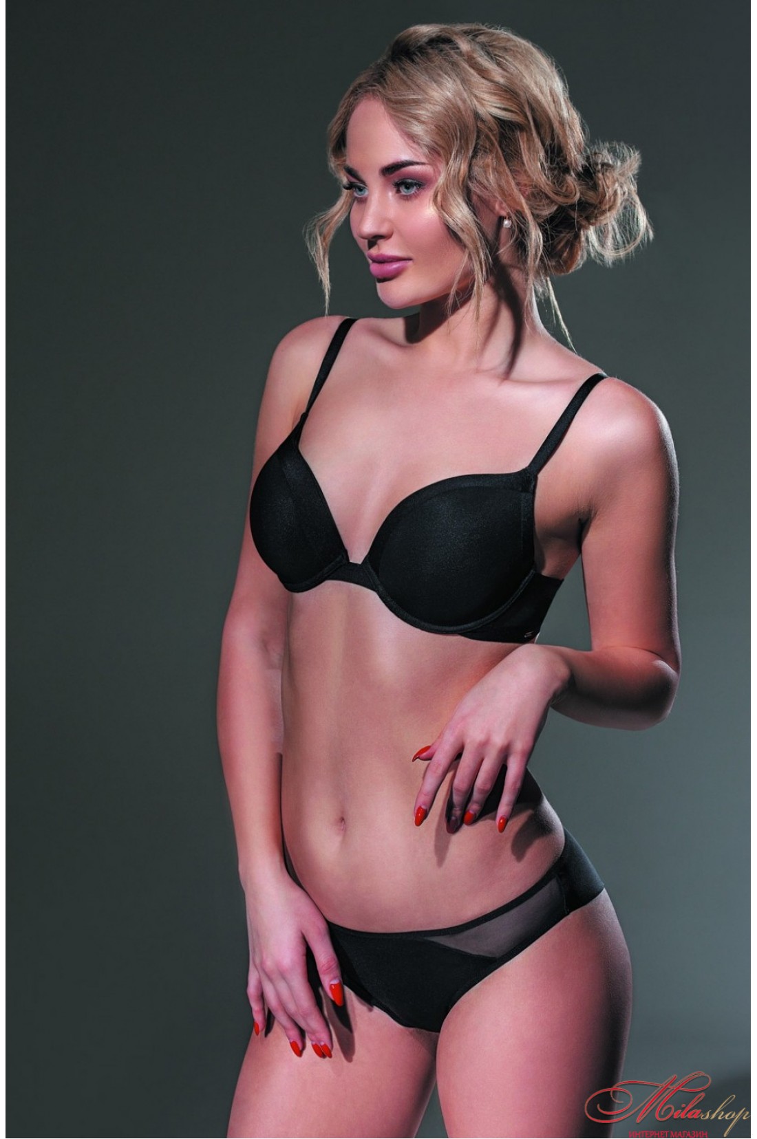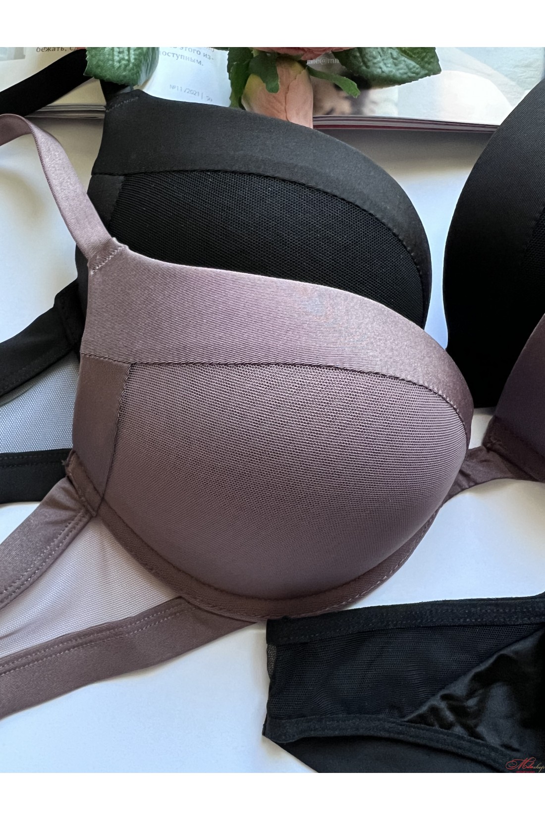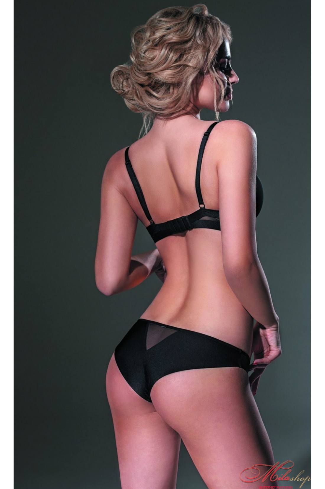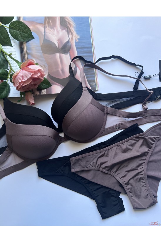 Практичний базовий комплект білизни з мікрофібри та сітки. Чашки з пуш-ап та тонкою перемичкою. Трусики бразиліана з середньою посадкою, спереду та ззаду є вставки з мікросітки.