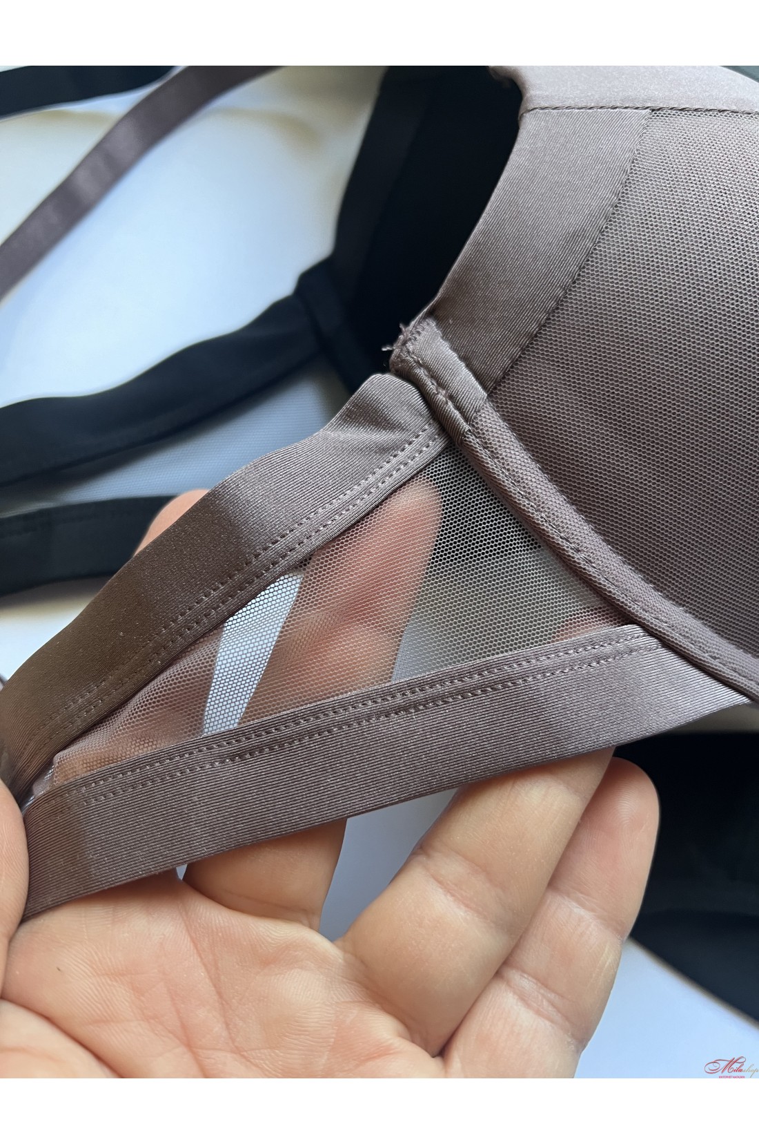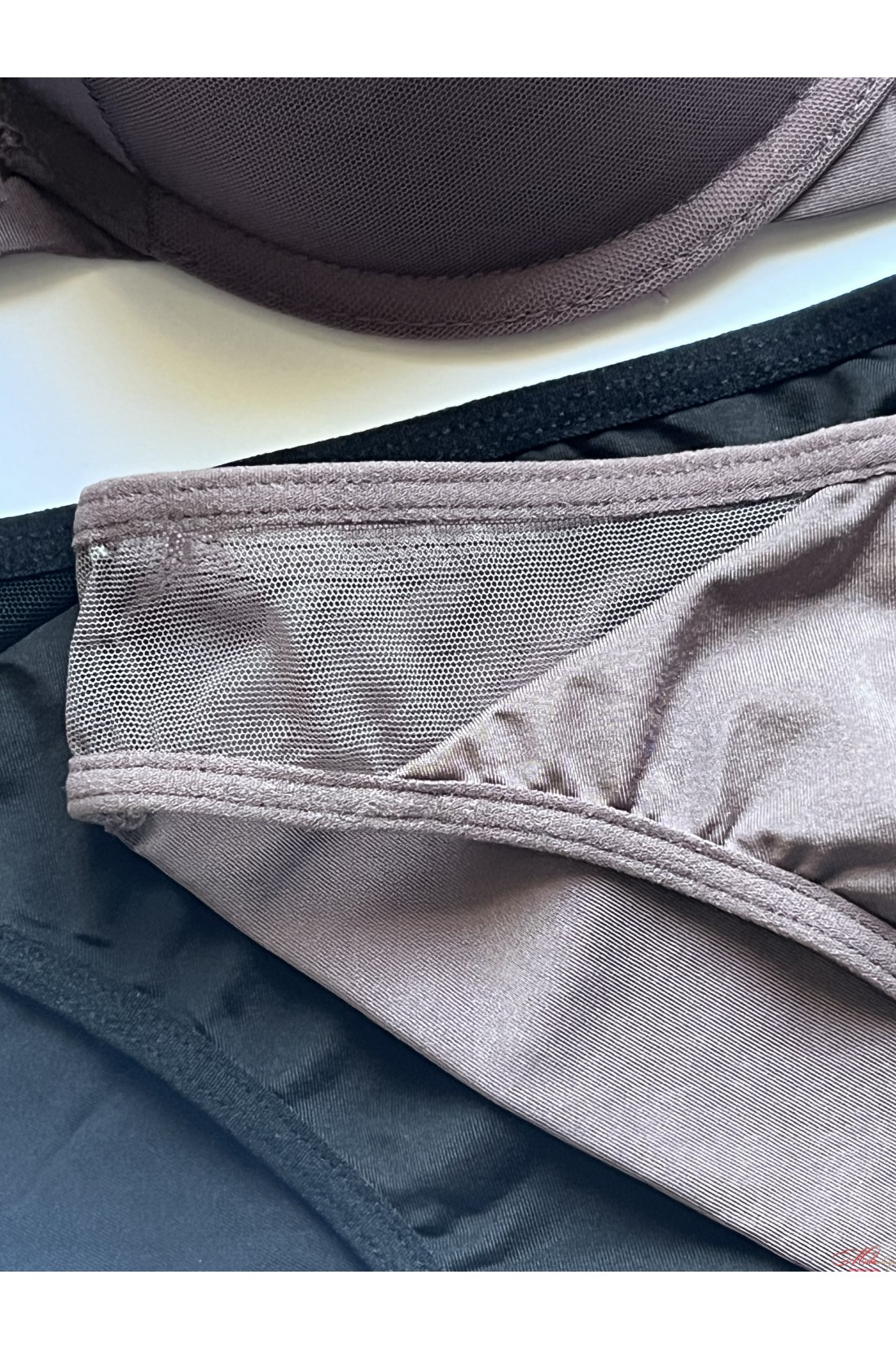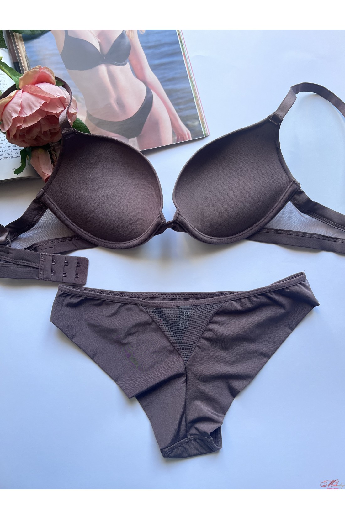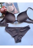 Практичний базовий комплект білизни з мікрофібри та сітки. Чашки з пуш-ап та тонкою перемичкою. Трусики бразиліана з середньою посадкою, спереду та ззаду є вставки з мікросітки.