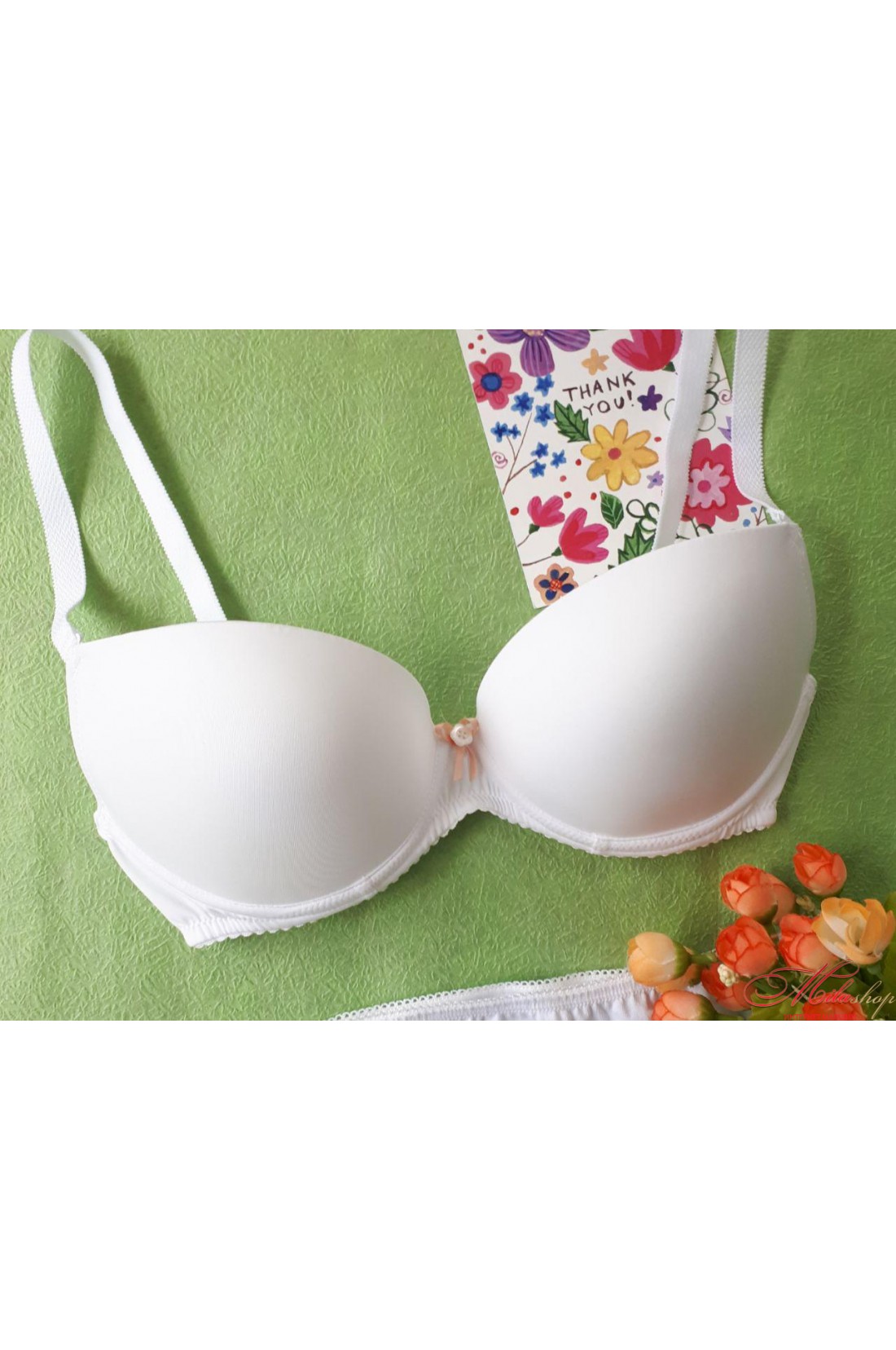 Базовий гладкий білий бюстгальтер зі знімними бретелями. Поролонова чашка має невелике ущільнення для надання правильної форми. Бюстгальтер має ще й бічну кісточку для фіксації стану, бретелі досить міцні, середньої ширини.