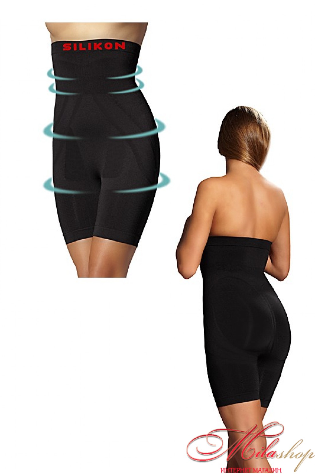 Високі утягуючі шортики. Верх зі смужками силікону, які надійно фіксують шорти та запобігають їх сповзанню, абсолютно не помітні під одягом. Добре коригують фігуру, підтягують стегна, талія стає тоншою на 2 розміри.
