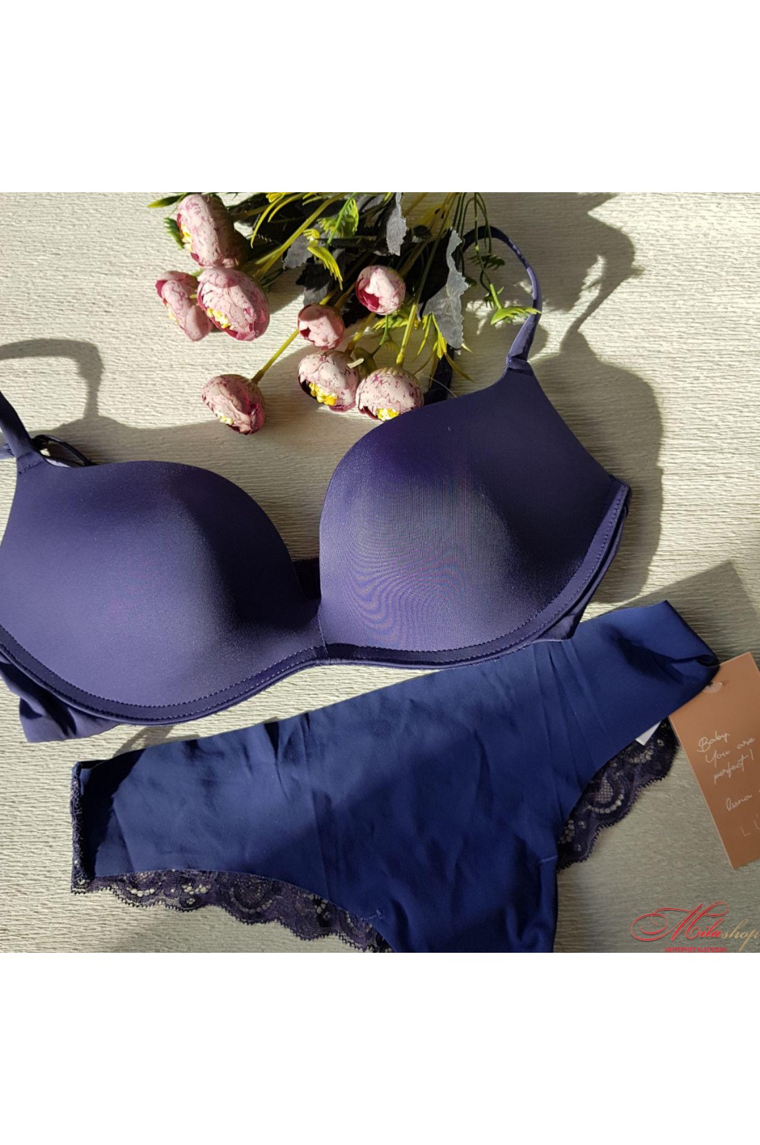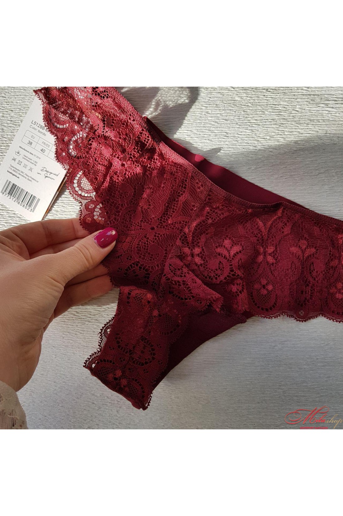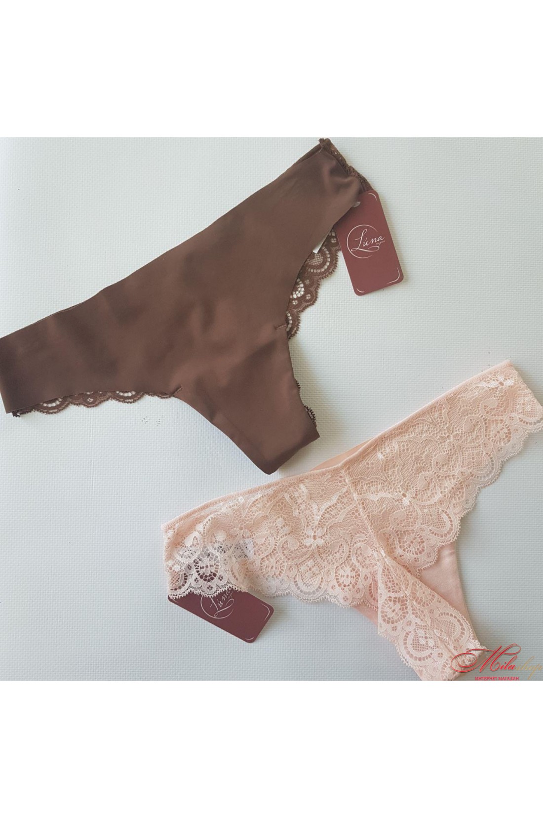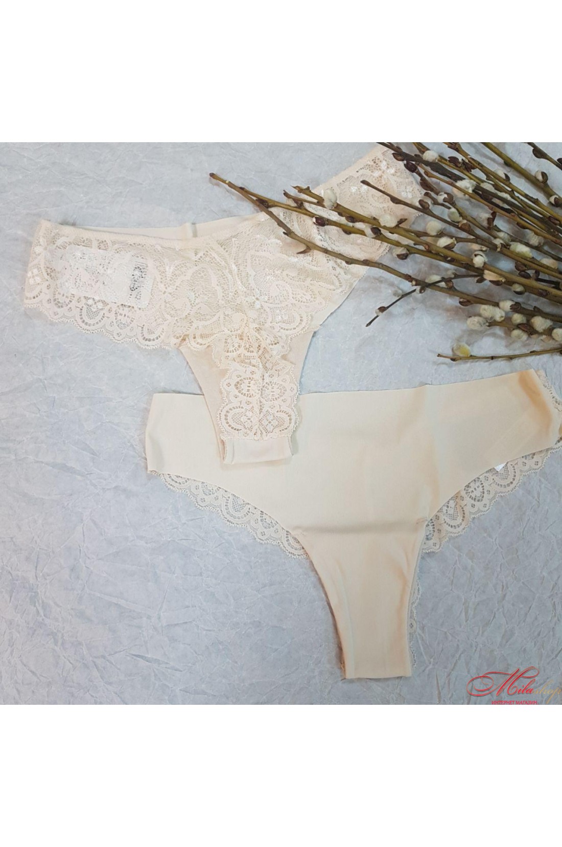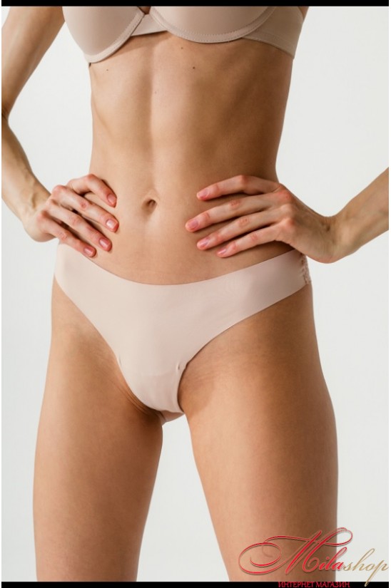 Бразиліана трусики з низькою лінією талії. Виконані з еластичного трикотажного полотна (мікрофібри) та еластичного мереживного полотна. Передня деталь виконана з мікрофібри з лазерною обробкою, а ззаду найкрасивіша мережива бразиліанка.