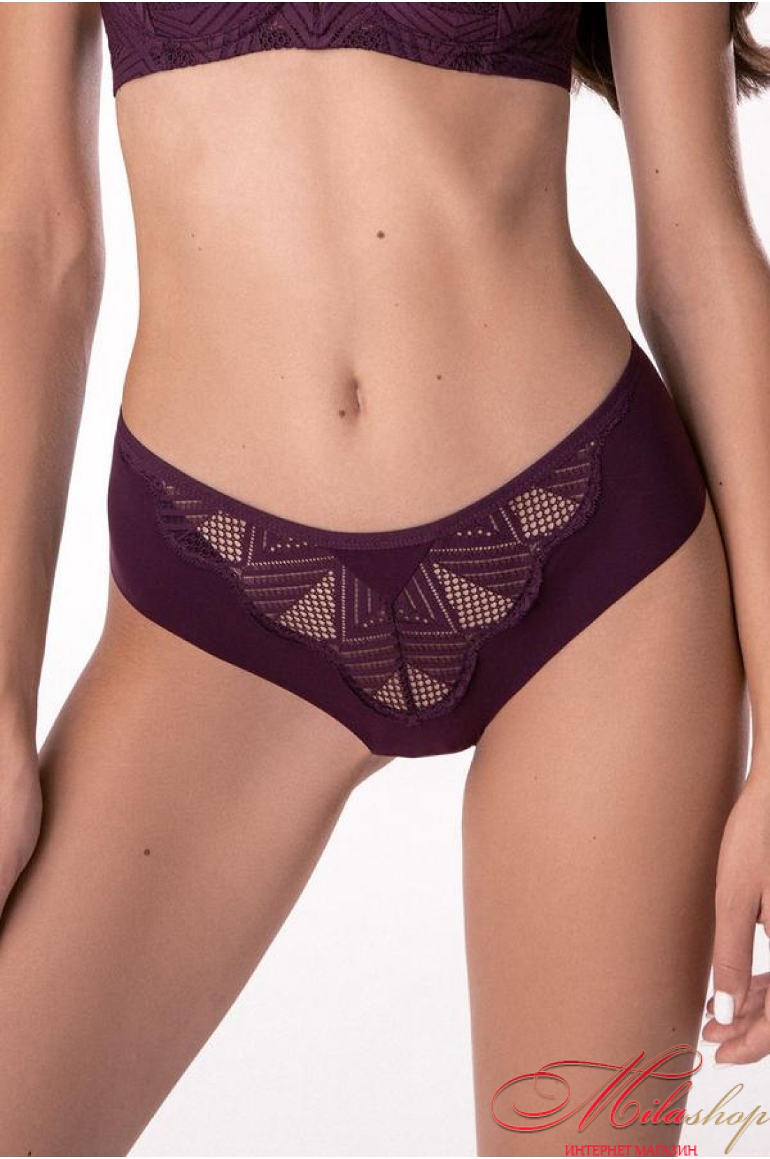 Трусики-сліп із французького мережива та італійського безшовного полотна. Ідеальна посадка, що вигідно підкреслює форми. Безшовні краю не виділяються під одягом. Середня лінія талії. Бавовняна гігієнічна ластівка.