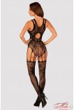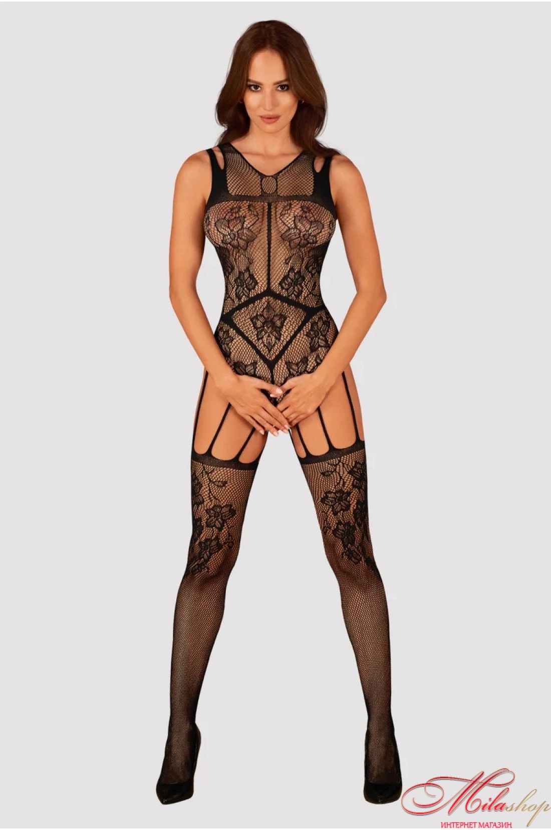 Облягаючий бодістокінг з ажурної сітки, тканина еластична, тягнеться у всіх напрямках та адаптується до форми тіла, підкреслює фігуру, розріз у ластовиці, без застібок та фурнітури. Бодістокінг виконаний із м’якого еластичного матеріалу, який другою шкірою лягає на тіло та підкреслює всі манливі згини. Поєднання дрібної, середньої та великої сітки дає приголомшливий ефект, акцентуючи увагу на ніжному животику, струнких ніжках та спинці. Верхня частина бодістокінга виконана у вигляді боді, прикрашеного квітковим малюнком. Завдяки великій комірці сітки спокусливо видно обриси грудей, квітковий малюнок лише злегка прикриває соски. Ромб у зоні пупка привертає увагу. Подвійні лямки ліфа гарно лягають на плечі та переходять на візерунчасту спинку з вирізом. Відкрита промежина — як чудове доповнення до цього дивовижному комбінезону. Сідниці обтягує велика сітка, стилізований пояс тримає стилізовані панчохи. Квітковий малюнок по панчохах спускається до колін.