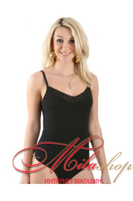 Классическое боди из нежной вискозной ткани. Выполнен в виде маечки на тоненьких бретелях, которая соединяется с трусиками стринг. Украшен кружевной тесьмой, по верхнему краю боди.