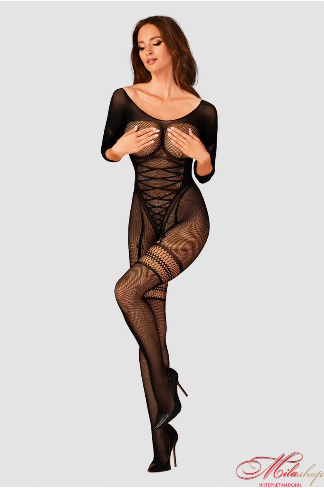 Сітчастий бодістокінг з імітацією підв’язок, виготовлений з м’якого стрейчевого матеріалу з комбінацією з дрібної та більшої сітки. Імітація корсета, підв’язок і панчіх зачаровує своєю реалістичністю. Бодістокінг має великий виріз, що привертає увагу до зони декольте й чуттєвих ключиць. Велика сітка на грудях красиво обтягує й підкреслює їх. Широка імітована шнурівка спереду і ззаду, а також висока посадка трусиків акцентують увагу на граціозному вигині спинки, ніжному животику й стегнах. Короткі рукави з комбінованої сітки мають дуже стильний вигляд. Імітація підв’язок і широкого пояса панчіх з великої сітки візуально подовжує ніжки й робить їх стрункішими. Стрілка ззаду на панчохах — маленьке сексуальне доповнення.