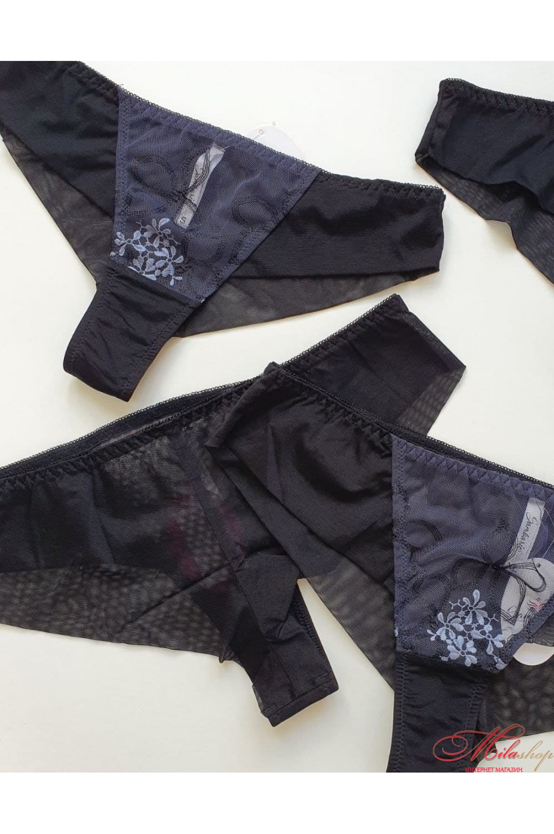 Трусики-бразиліана із мікросітки з вишивкою. Середня лінія талії підкреслює сідниці. Бавовняна гігієнічна ластівка.
