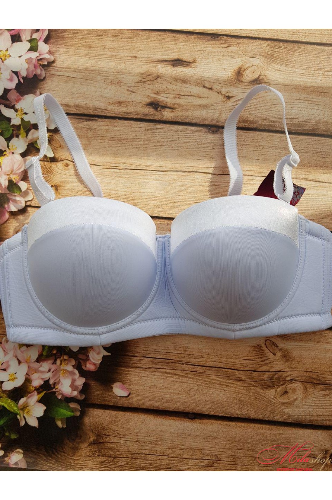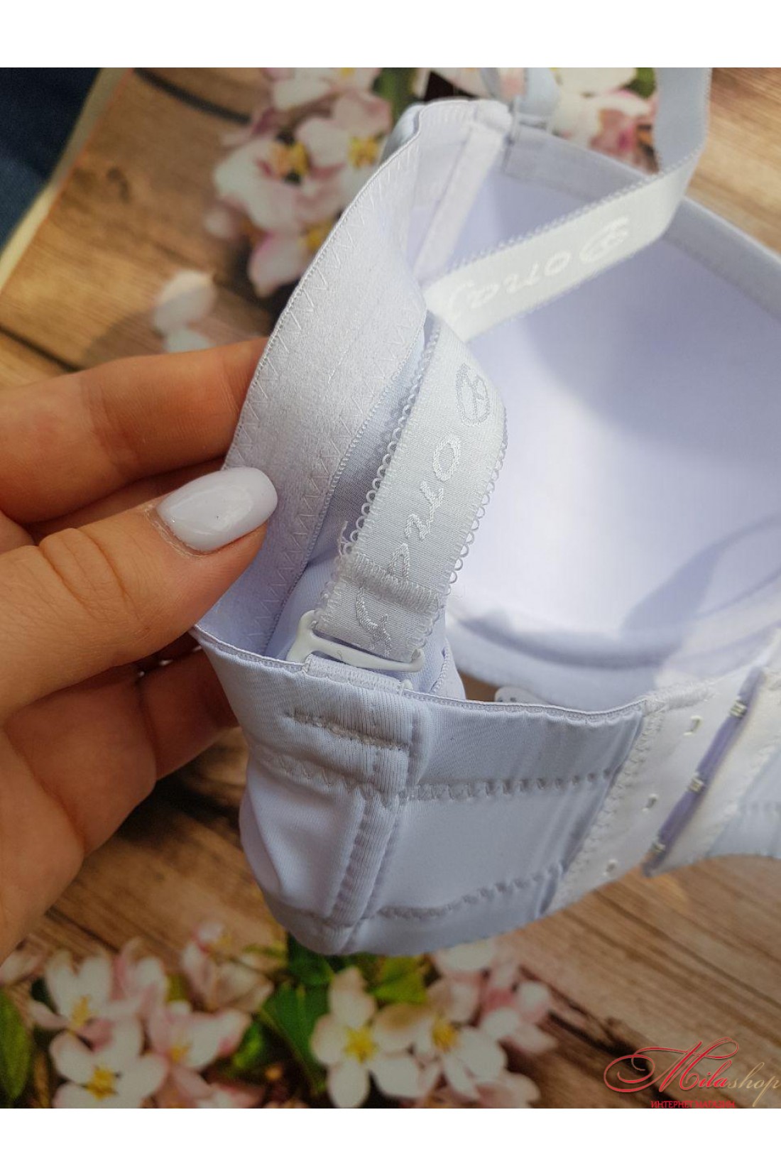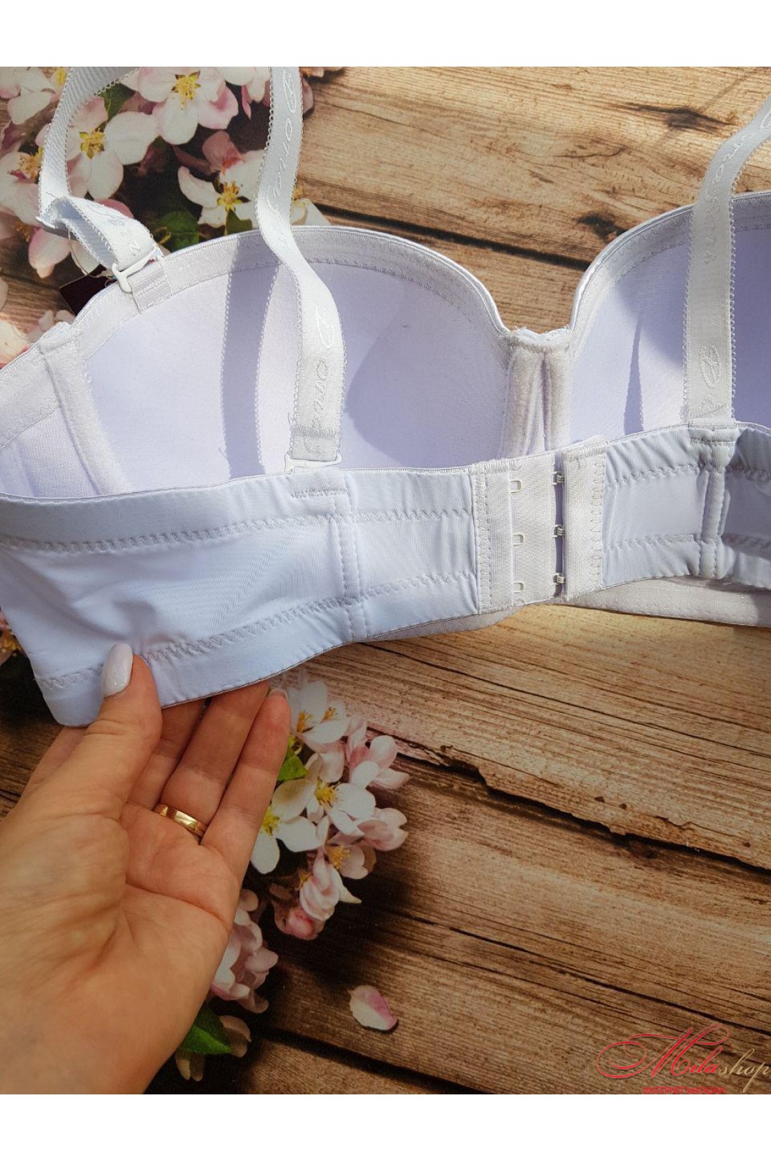 Бюстгальтер балконет із гладкими поролоновими чашками. Широкі, знімні бретелі. Широкий пояс забезпечує хорошу підтримку грудей. Спинка просиликонена, завдяки чому бюстгальтер можна сміливо носити без бретелів і не боятися сповзання.