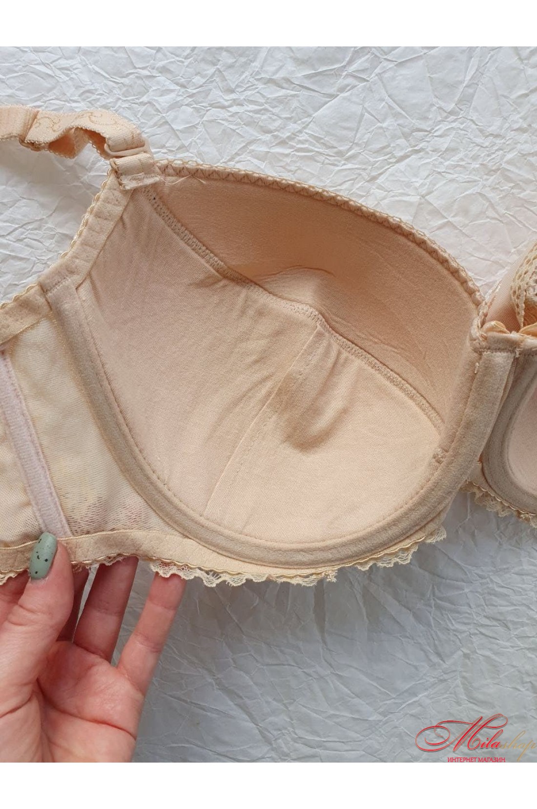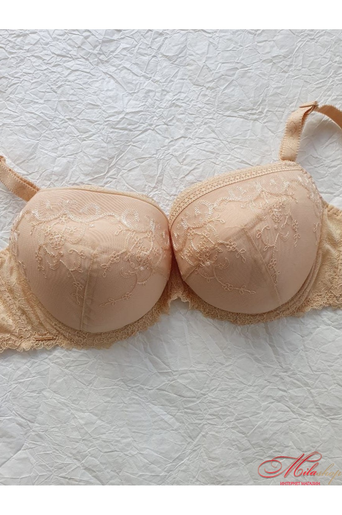 Комфортний бюстгальтер балконет, з бавовняною підкладкою зсередини. Широкі бретелі, що відстібаються. Мереживна спинка. Чашки бюстгальтера оздоблені вишивкою.