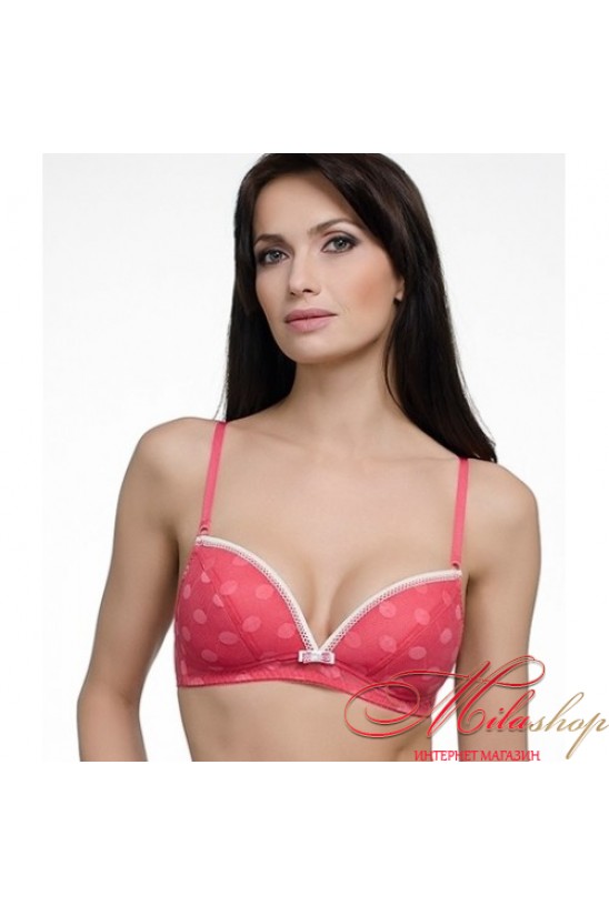 бюстгальтер из эластичного трикотажного кружевного полотна. Без каркасов. Чашки с двойным членением, на дубляже с хлопком. Упругие пластины в боковых деталях стана. Отделка - контрастная эластичная тесьма по верхнему срезу чашек и бантик.