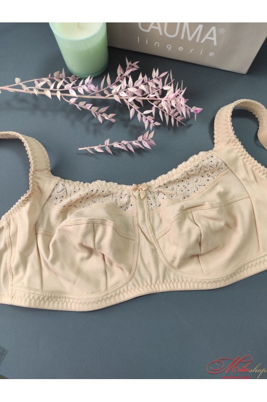 Бюстгальтер із м'якою чашкою без каркасів, з розширеними бретелями. Виконаний з еластичного полотна, що містить бавовну, та м'якого еластичного мережива. М'які чашки з горизонтальним кроєм із внутрішньою бічною деталлю. Передня частина бретелів декорована мереживом, продубльована бавовняним трикотажем та тонким шаром поролону, задня частина з еластичної тасьми. По нижньому краю бюстгальтера пришита м'яка широка гумка.