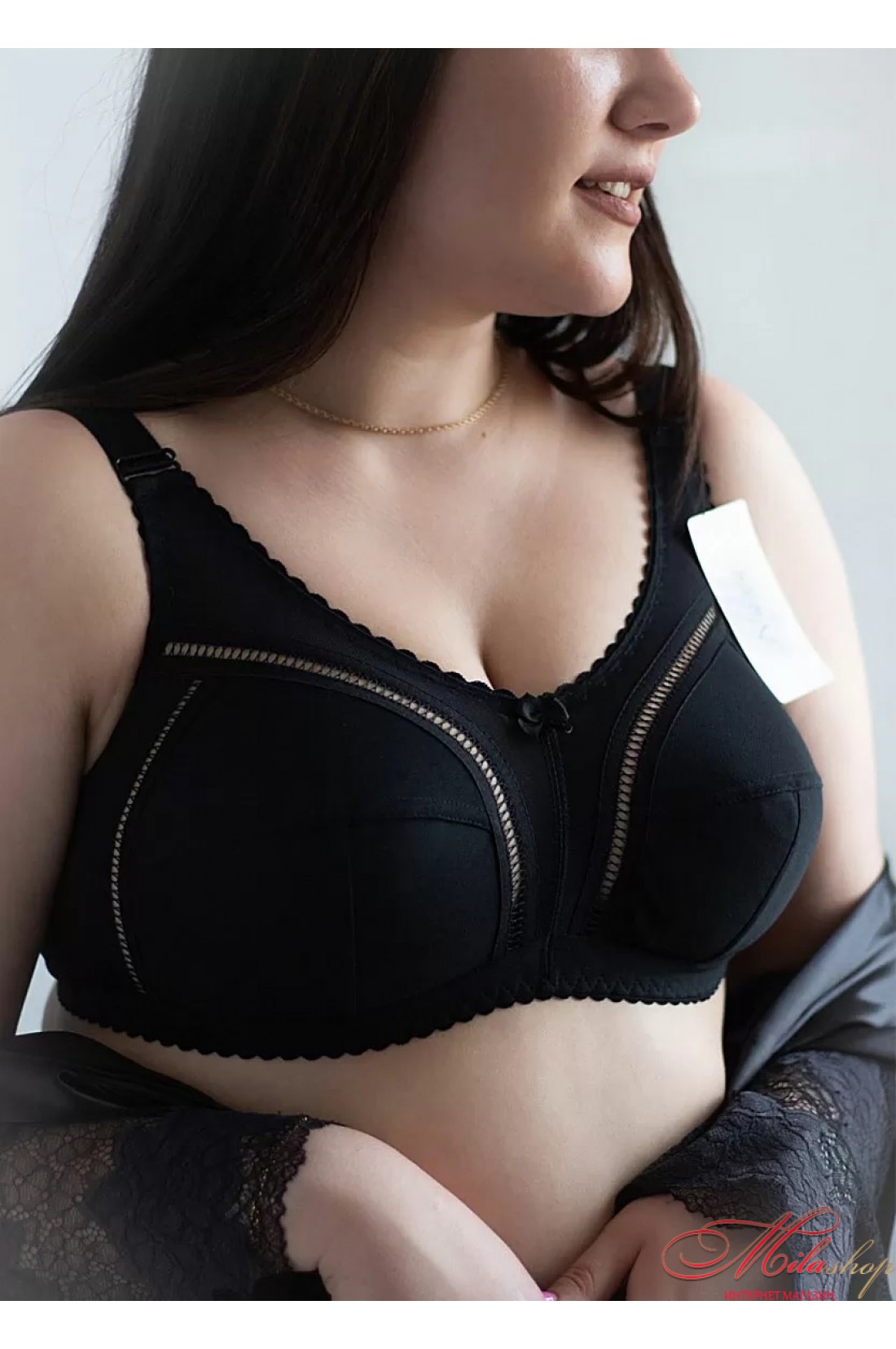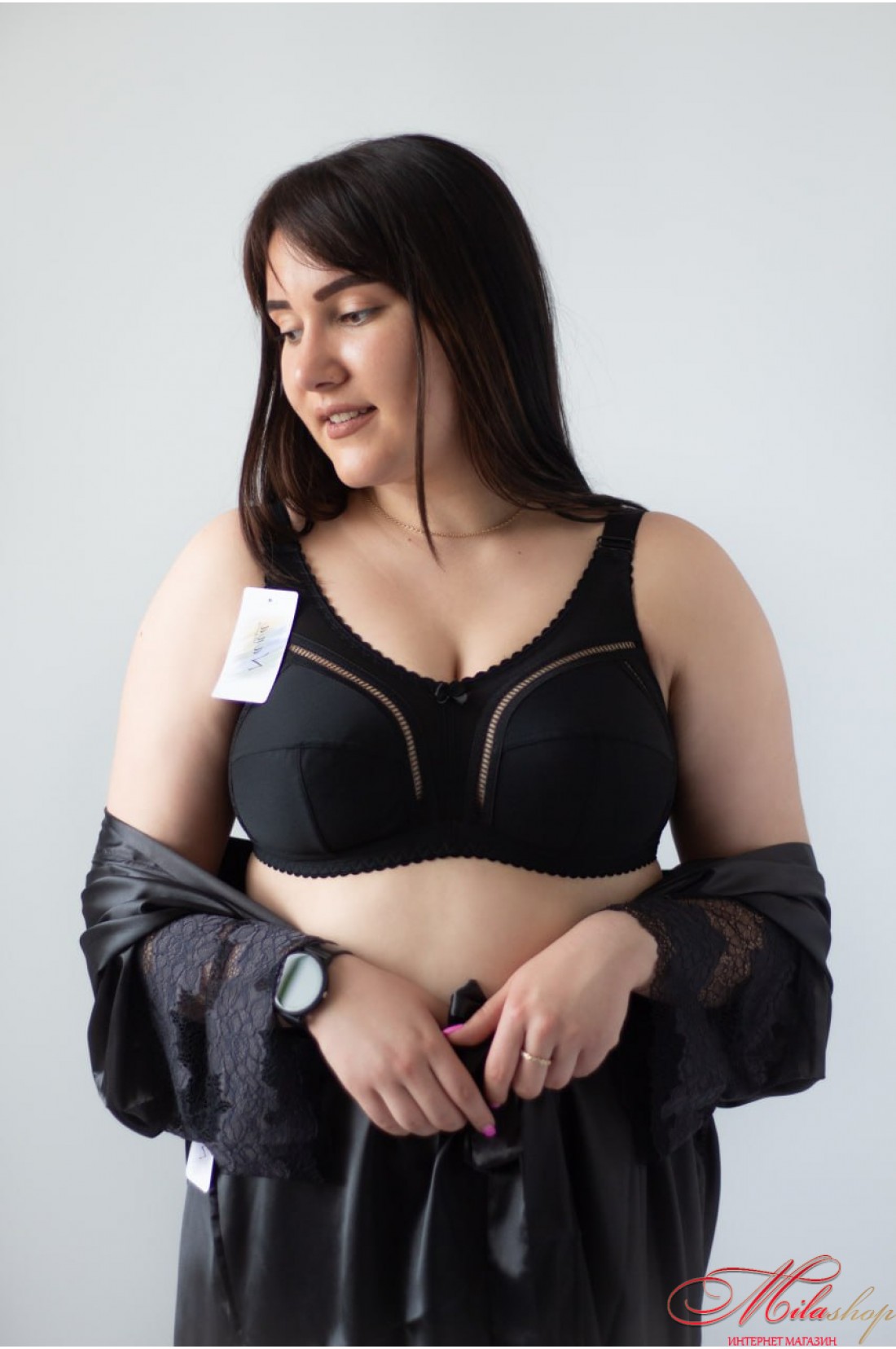 Прекрасний бюстгальтер з м'якими чашками без кісточок. Модель забезпечує хорошу підтримку грудей, зручна для щоденного носіння, рівномірно розподіляє навантаження на хребет. Виготовлений із еластичного трикотажного полотна. Внутрішня частина чашки продубльована бавовняним полотном. Бічна та нижня частина чашки виконані з ламінованої тканини. Конструкція чашки спеціально розроблені для великих грудей. Бретели не знімні, регулюються по довжині.