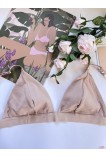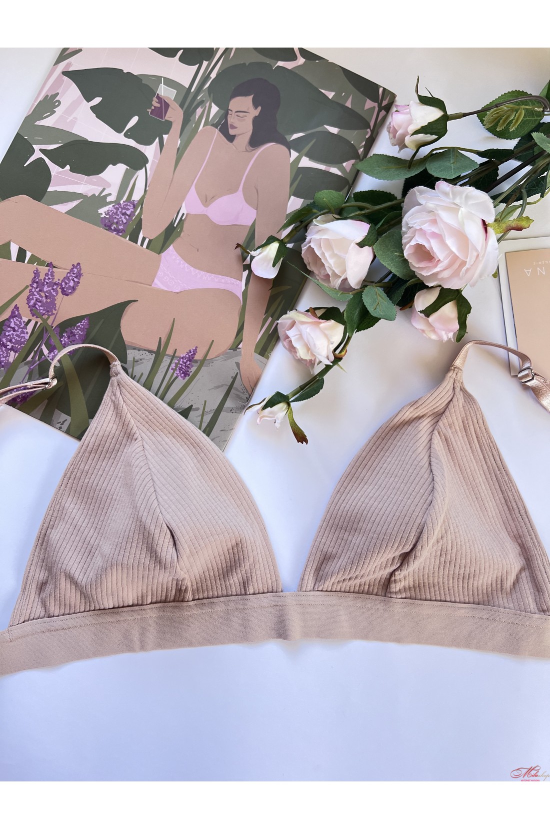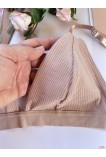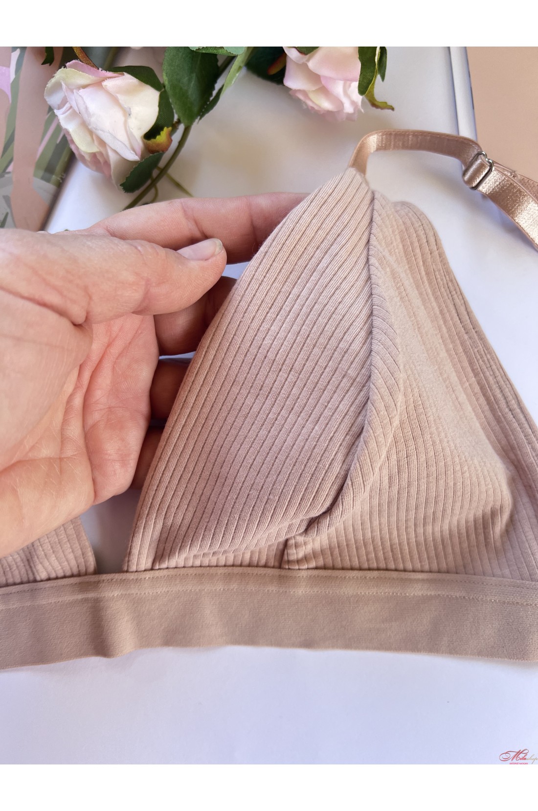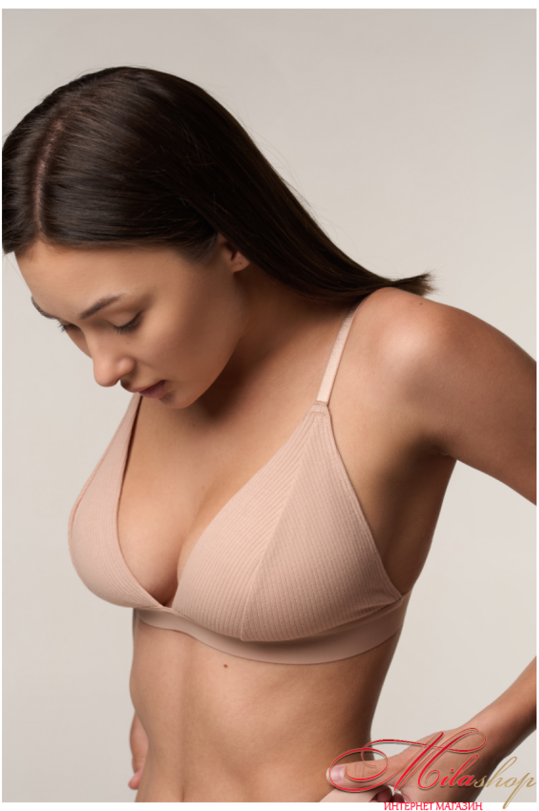 Бюстгальтер без кісточок з еластичної бавовни. М’який треугольний бра, з бавовни в рубчик, внутрішня частина продубльована тонкою сіткою для тримання форми. Стан (основа) вироблена з декоративної гладкої резинки. Дуже сучасний комфортний бра.