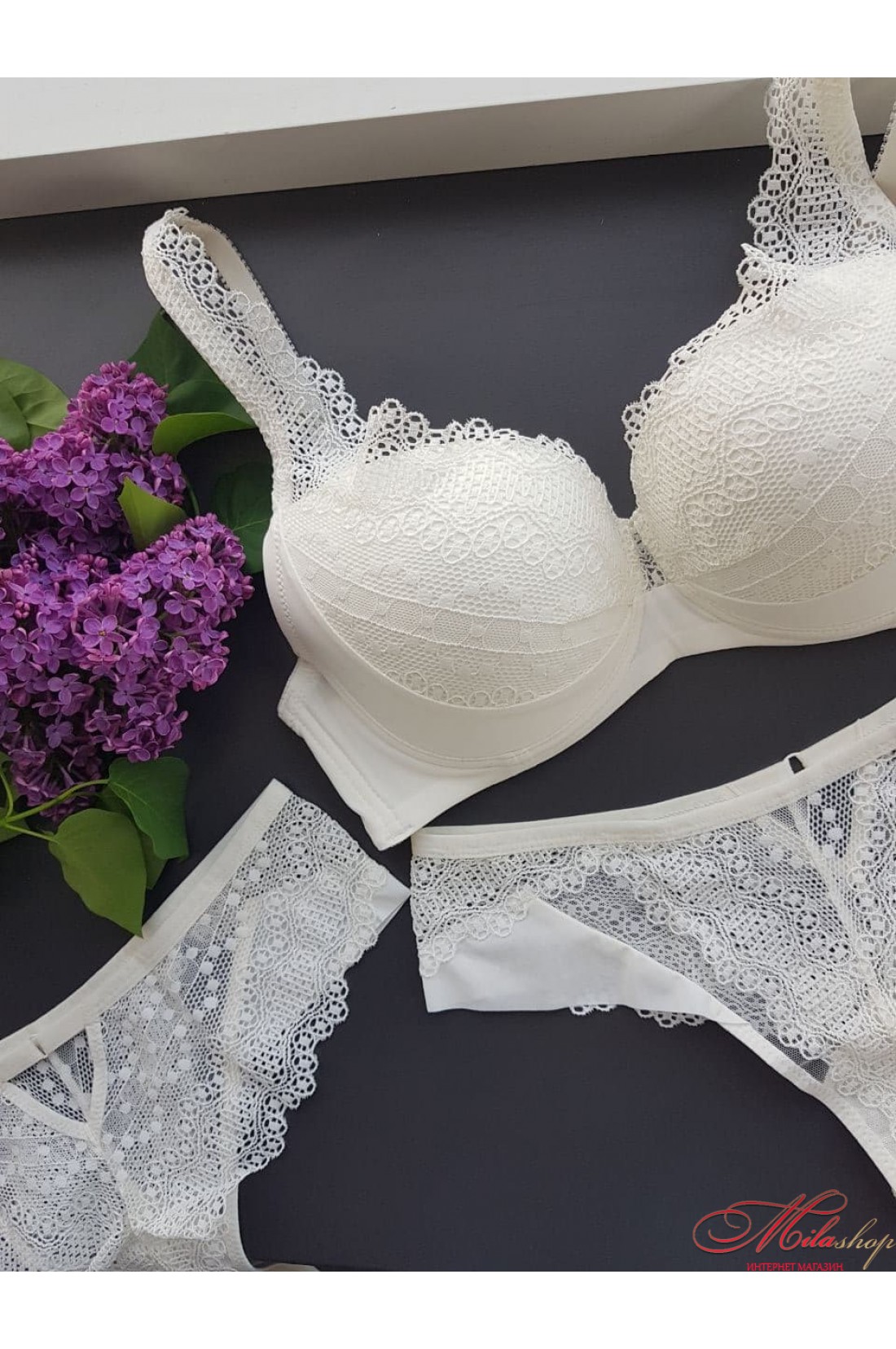 Мереживний бюстгальтер із формованими чашками без пуш-ап, на кісточках. Бретели незнімні, регулюються по довжині, декоровані мереживом. Пояс бюстгальтера із гладкого полотна.
