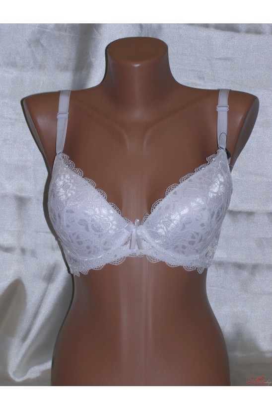 Бюстгальтер с кружевными чашками на тоненьком поролоне. Чашки на косточках,есть боковые косточки. Бретели сьемные. Застежка на один крючок в трех положениях.