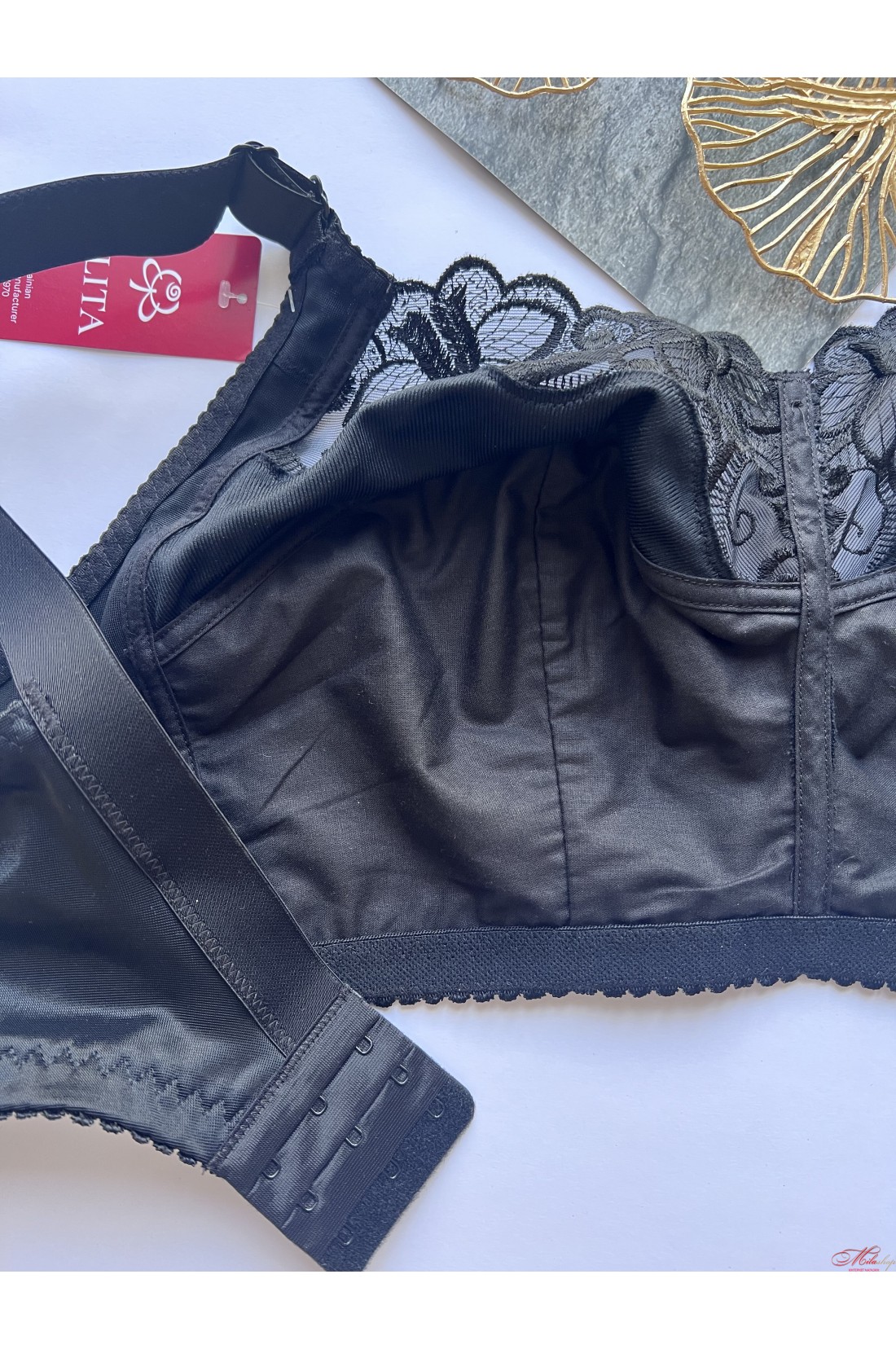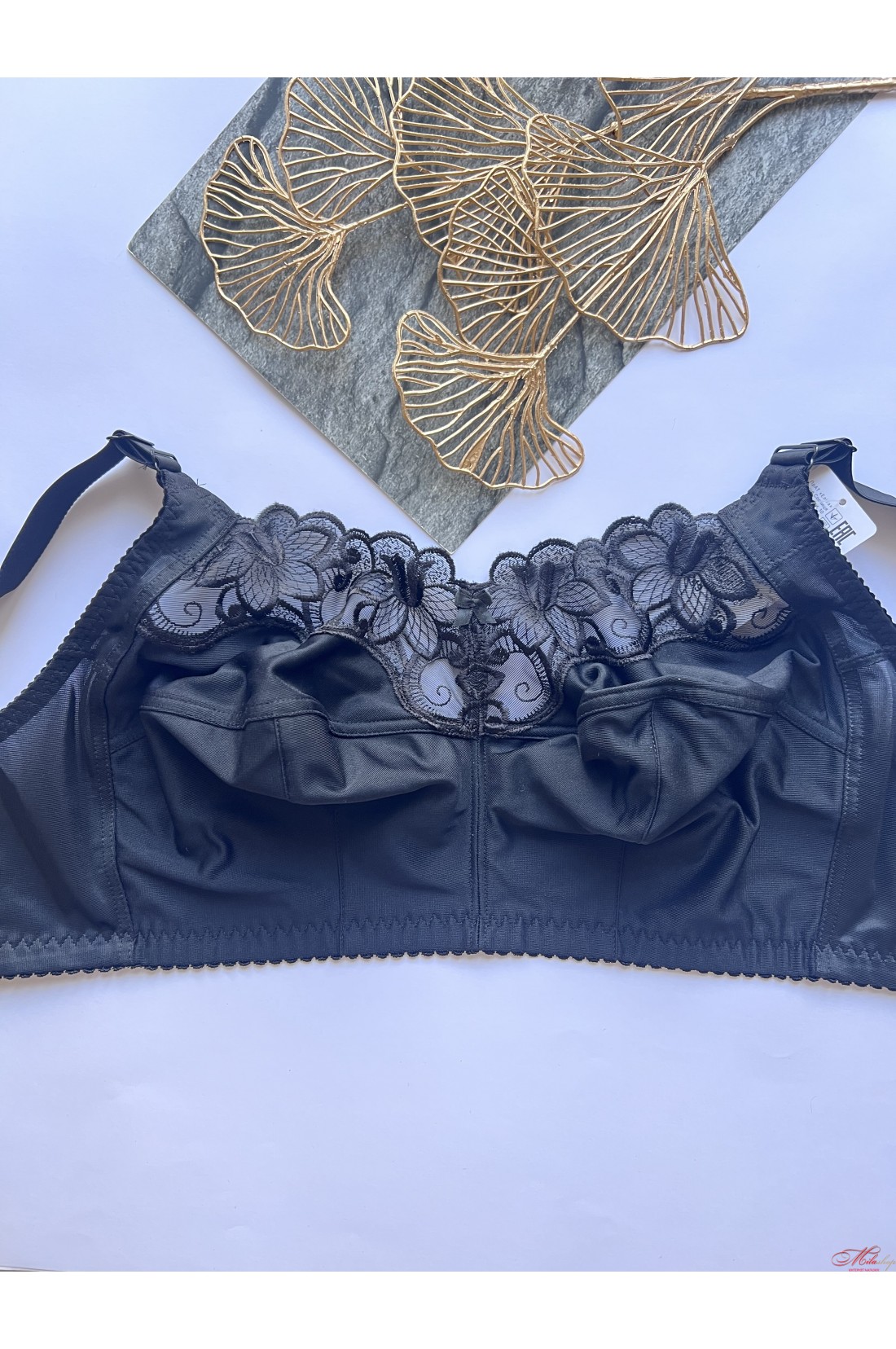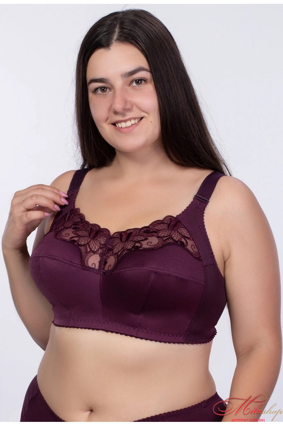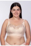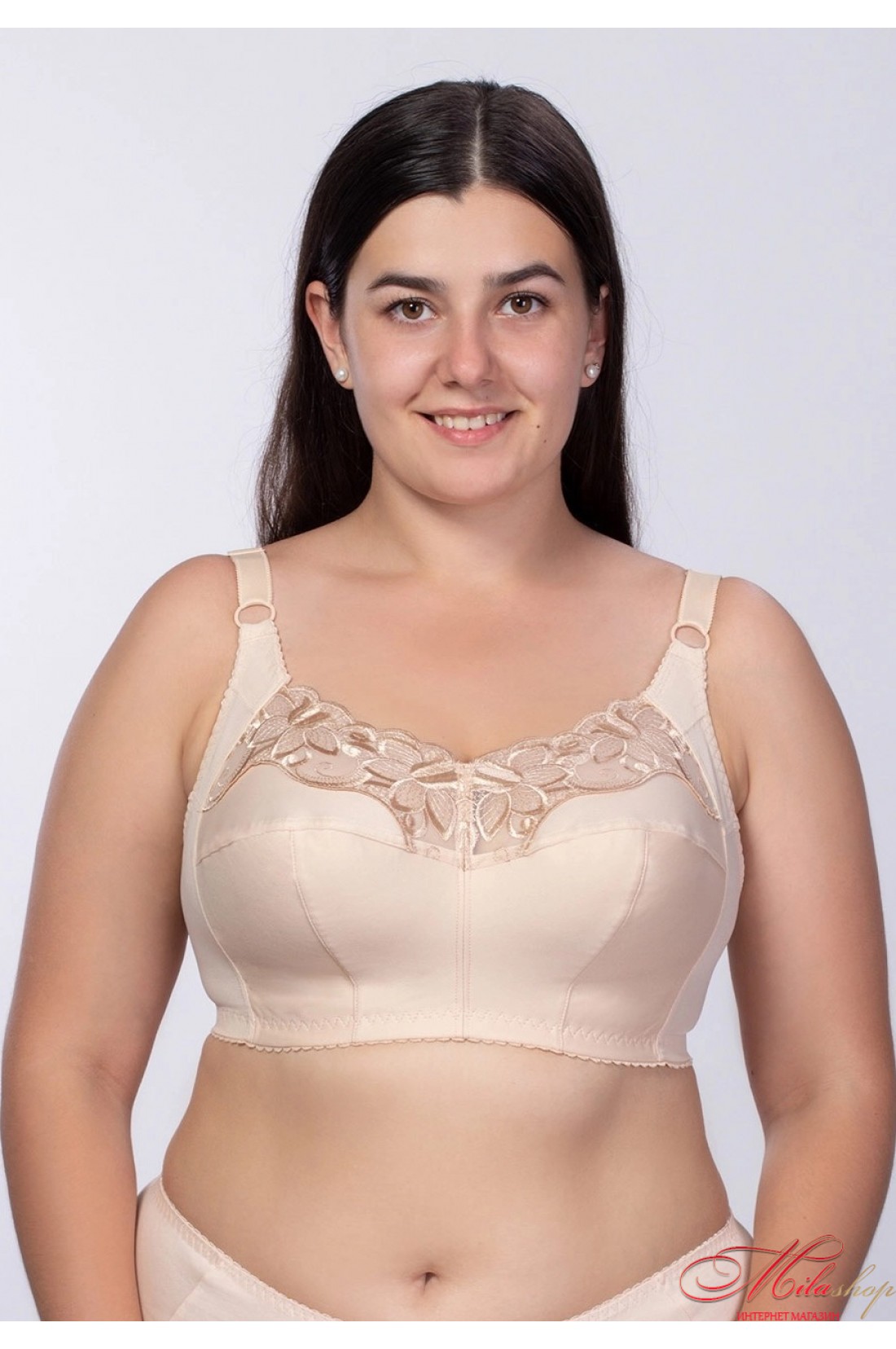 Базовий бюстгальтер для максимальної підтримки пишних грудей, м'які глибокі чашки закривають груди і не додають об'єму. Чашки пошиті з 3 деталей з додатковою коригуючою вставкою навколо, що дозволяє максимально закрити груди. Без кісточок чашки не врізаються і не здавлюють груди, бавовняна підкладка не викликає подразнення, стикаючись зі шкірою. Широкі бретелі не відстібаються, регулюються по довжині, рівномірно розподіляють навантаження на плечі та знімають його зі спини та хребта. Гладка спинка із широкою бічною деталлю. Верхня деталь чашок оздоблена вишивкою.