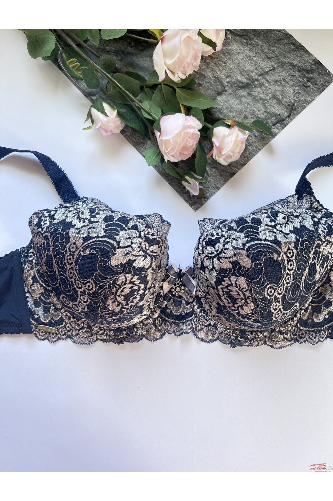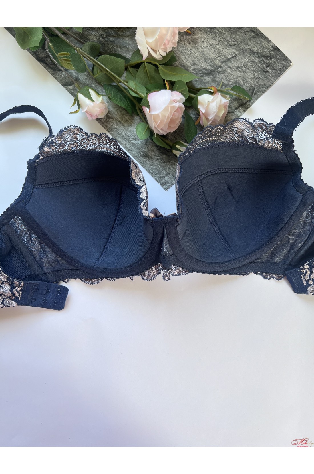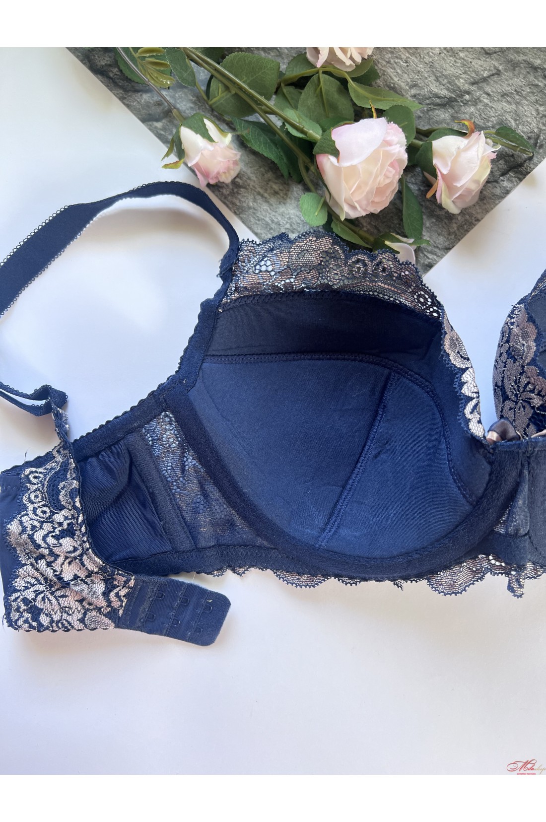 Чашка бюстгальтера на кісточках, на тонкому напівпоролоні, всередині бавовняна підкладка. Бретели незнімні, регулюються по довжині. Прикрашений гарними вставками із мережива.
