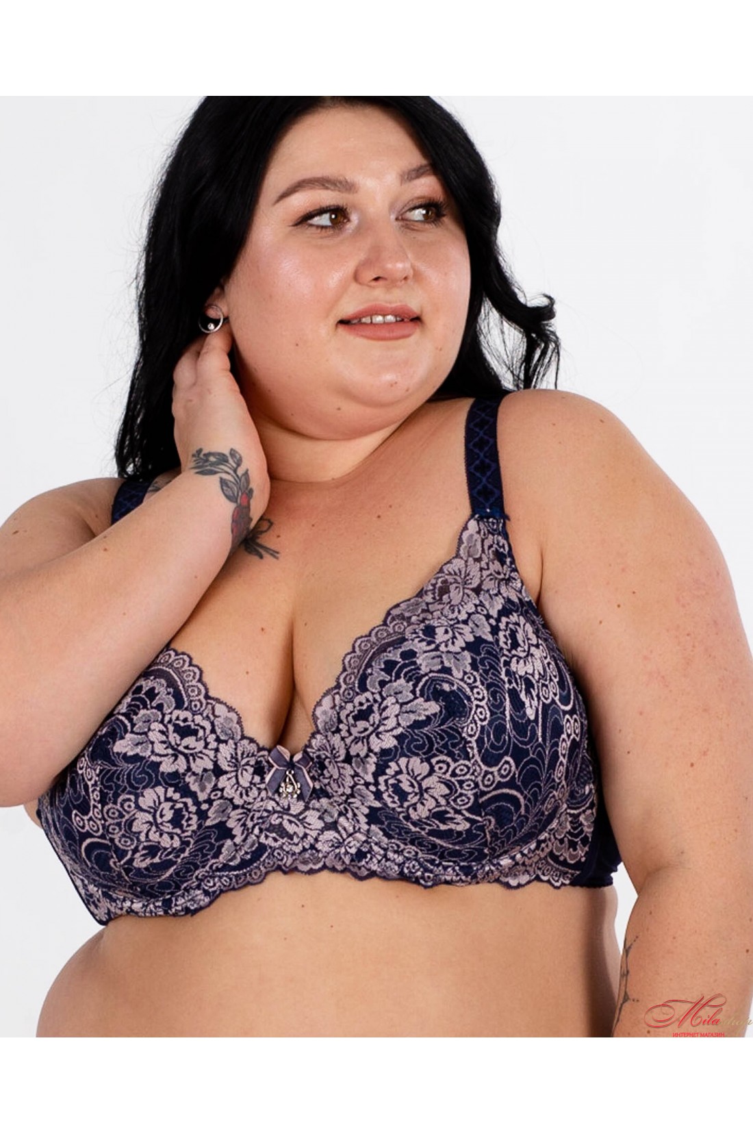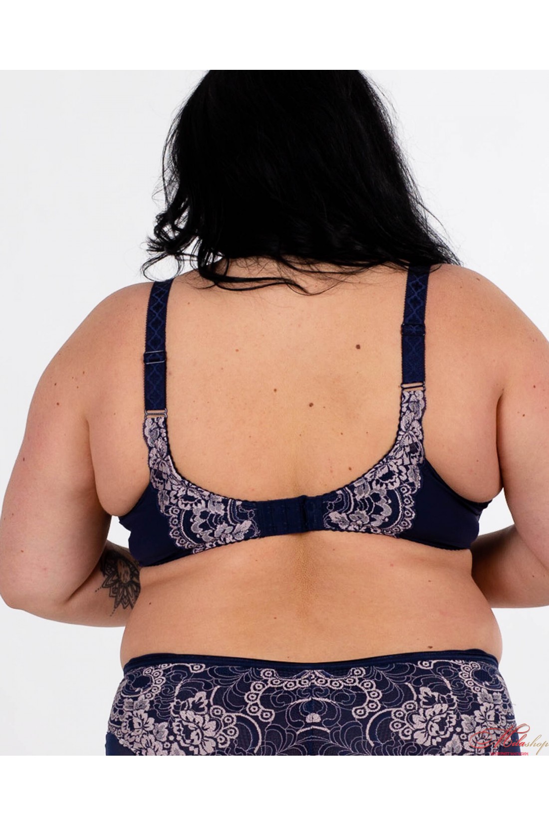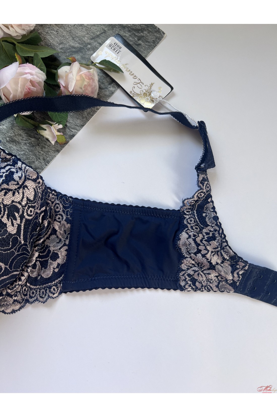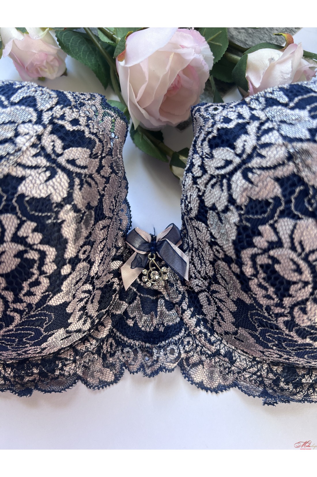 Чашка бюстгальтера на кісточках, на тонкому напівпоролоні, всередині бавовняна підкладка. Бретели незнімні, регулюються по довжині. Прикрашений гарними вставками із мережива.