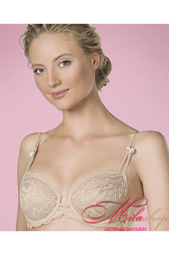 Бюстгальтер из эластичного трикотажного полотна и эластичного кружева, на каркасах. Нижние детали чашек на подкладке. Бретели типа "спагетти" декорированы бантиками.