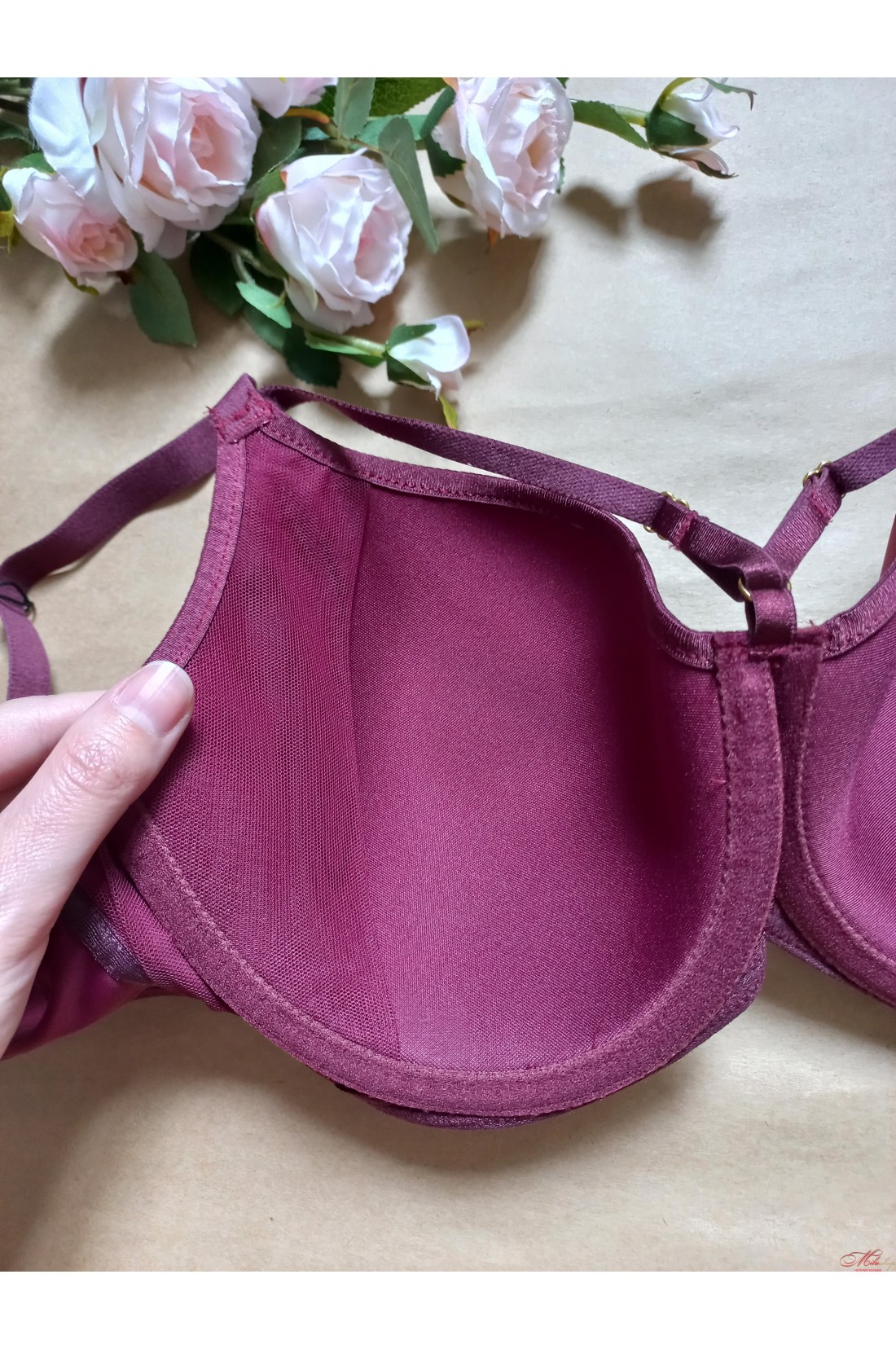 Бюстгальтер виготовлений із особливого матеріалу спейсера, який легкий та добре пропускає повітря. У цьому зберігає форму. Матеріал дозволяє шкірі дихати та відводить зайву вологу. Бюстгальтер з декоративними незнімними бретелями та підвіскою. Бретель не відстібається, ширина залежить від розміру бюстгальтера.