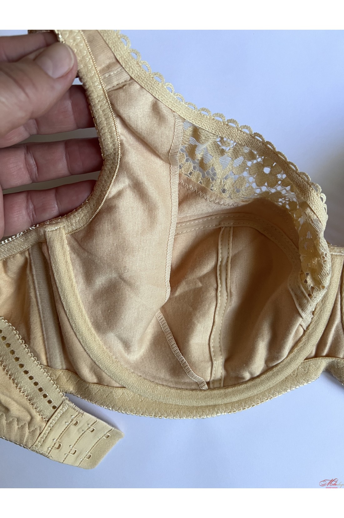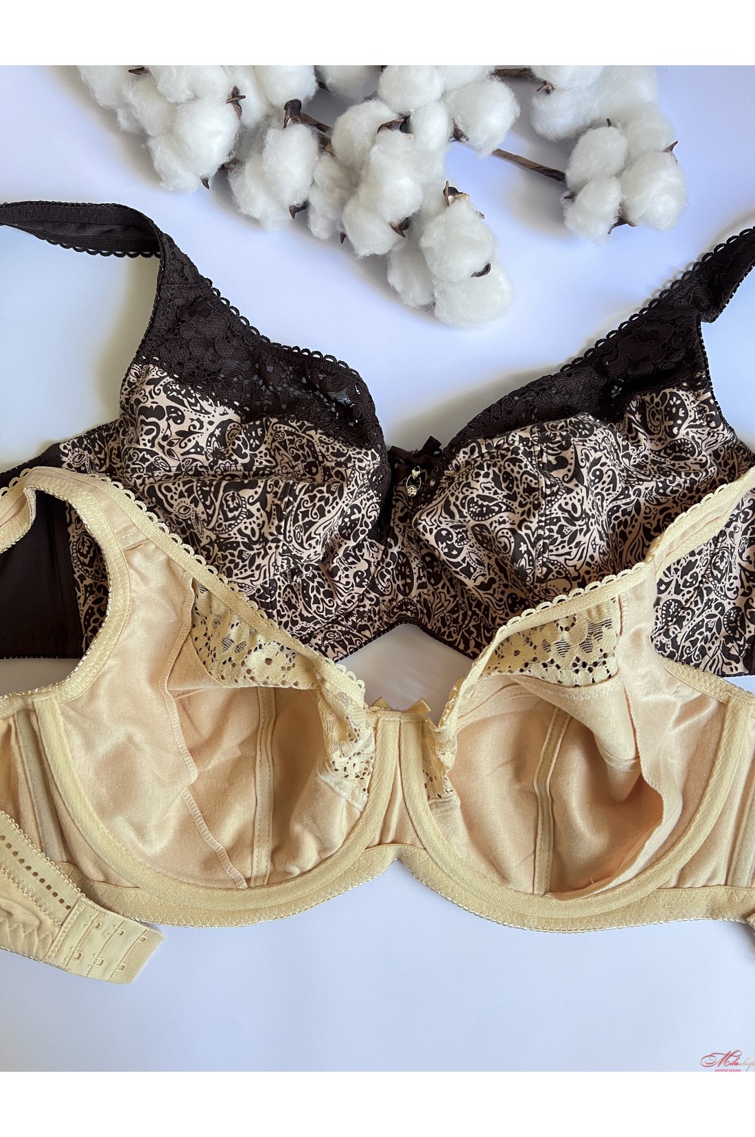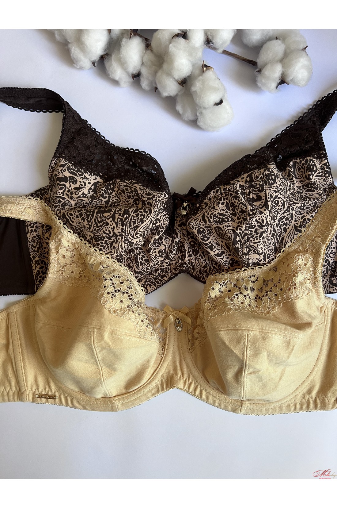 Бюстгальтер на кісточках, м"яка тканева чашка (слабко розтягується), без поролону. Усередині чашки є додаткова тканинна бічна підтримка. Чашка прикрашена еластичним мереживом, гладка спинка, незнімні широкі бретелі, застібка в три ряди на 2 гачки. За рахунок своєї конструкції бюстгальтер добре тримає груди великих розмірів. Рекомендуємо використовувати трусики 55848.