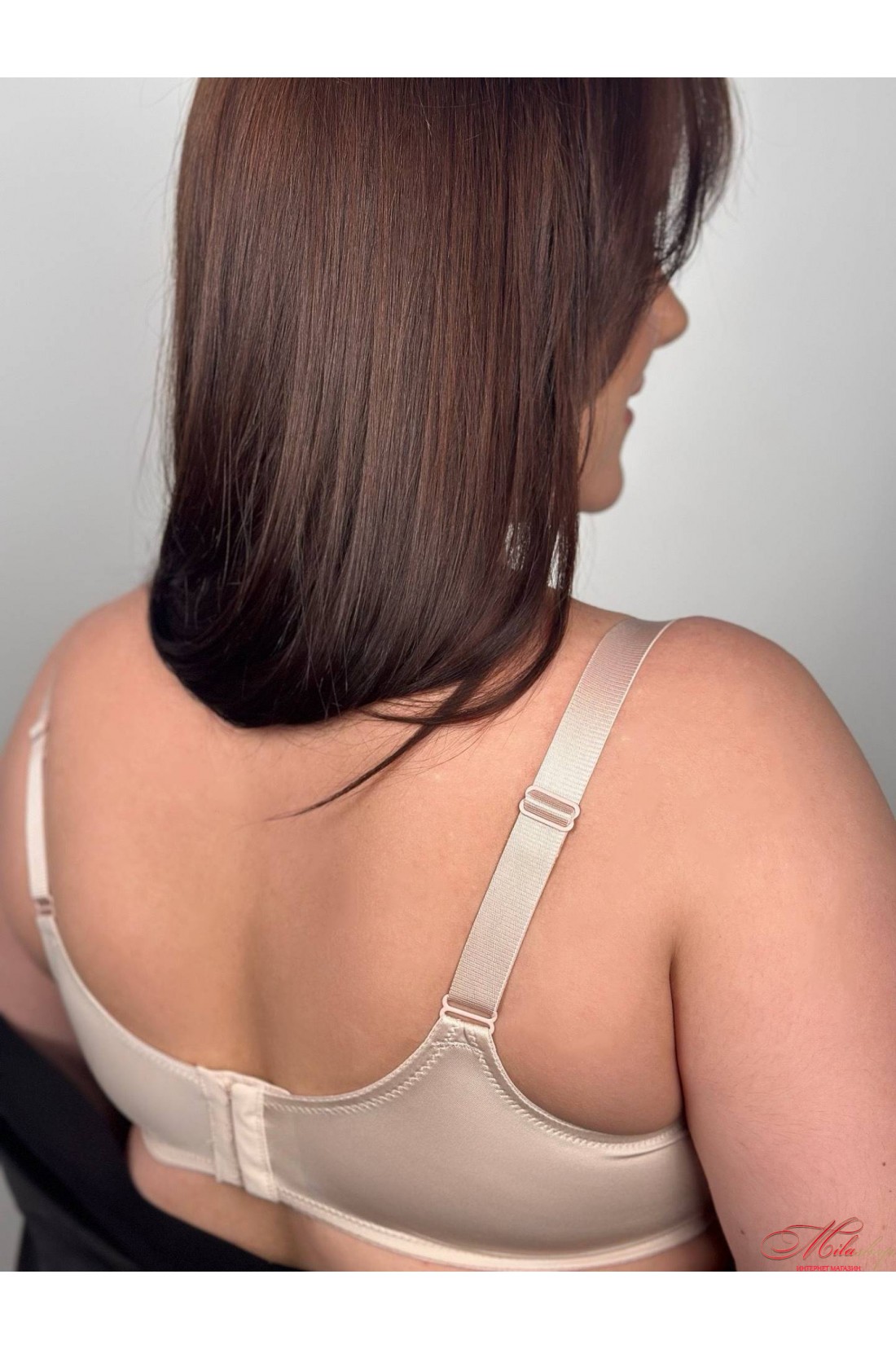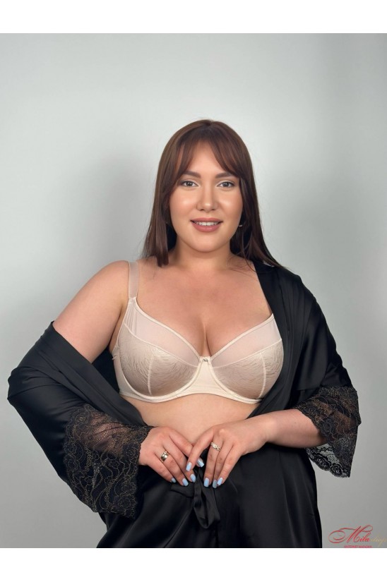 Бюстгальтер для підтримки пишних грудей, зшивні чашки на кісточках, верхня частина чашки з мікросітки, нижня з нееластичного жаккардового полотна, бретелі не відстібаються, регулюються по довжині, гладка япинка, застібається на спині гачками.