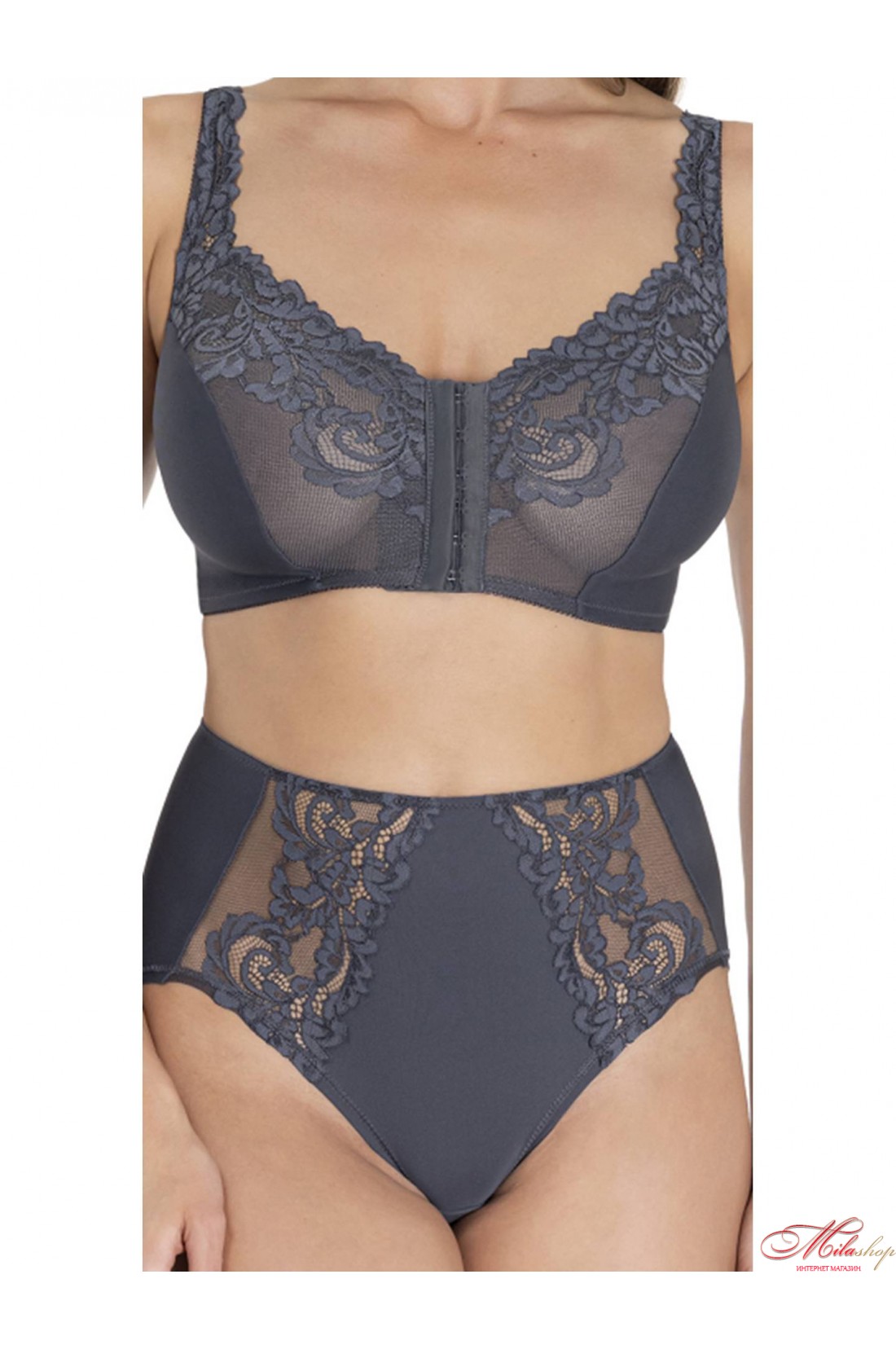 Бра-топ зі вставкою з мікросітки, м'які чашки без кісточок підтримують груди і не додають об'єм, не здавлюють, бретелі регулюються по довжині, спереду застібається гачками. Бюстгальтер без каркасів з застібкою попереду , чашка та бретель декоровані мереживом . З середини чашка має бавовняний підклад .