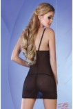 Модель выполнена в страстном черном цвете, короткая, приталенная, идеально повторяет изгибы женского тела. Если сзади она однотонная и однотекстурная, то спереди ее дополняет кружевная продольная вставка с фантастическим цветочным мотивом. Чашка – на косточке, бретели – тонкие, регулируемые, спереди раздвоенные. Аккуратные бантики на бретелях и лифе служат небольшими, но точными акцентами пеньюара. В комплект входят черные трусики-стринги.