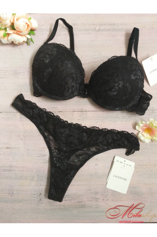 Необъятное ночное небо завораживает. Коллекция Night украинского бренда Жасмин впечатляет не меньше. Черное кружево с нитями люрекса переливается и мерцает, как небесные созвездия. Комплект состоит из кружевного бюстгальтера со встроенным push-up и трусиков стринг. Бюст имеет формованные чашки на косточках, которые приподнимают грудь и формирую пышную линию декольте; внутренняя деталь чашки из хлопка; бретели не отстегиваются, регулируются по длине; спинка кружевная; застежка на спине: 2 крючка на 3 позиции; блестящее кружево с люрексовой нитью мерцает и переливается; между чашками бантик с подвеской. Трусики полностью кружевные, ластовица хлопок. полиамид – 78% эластан – 14% хлопок – 8%