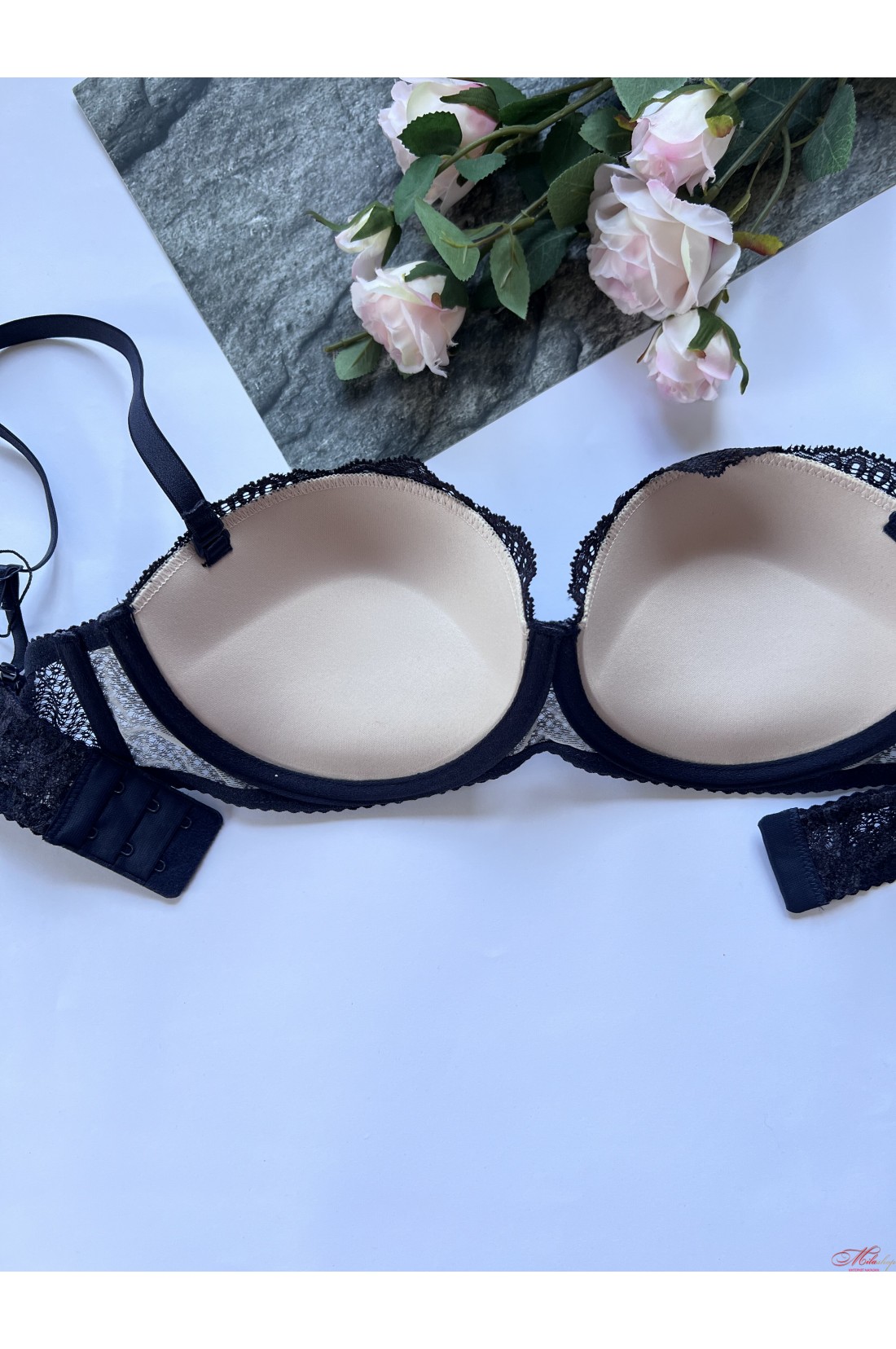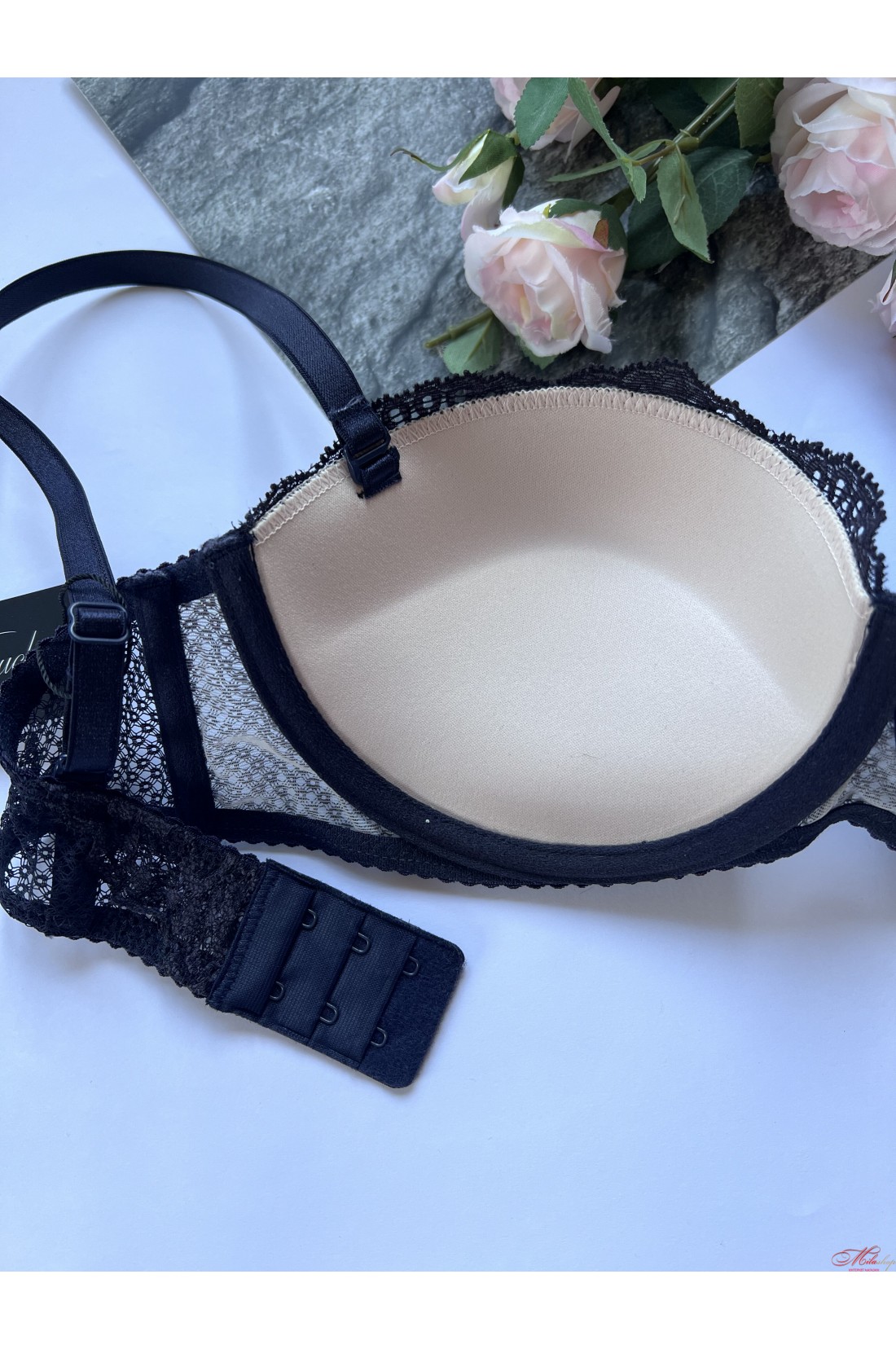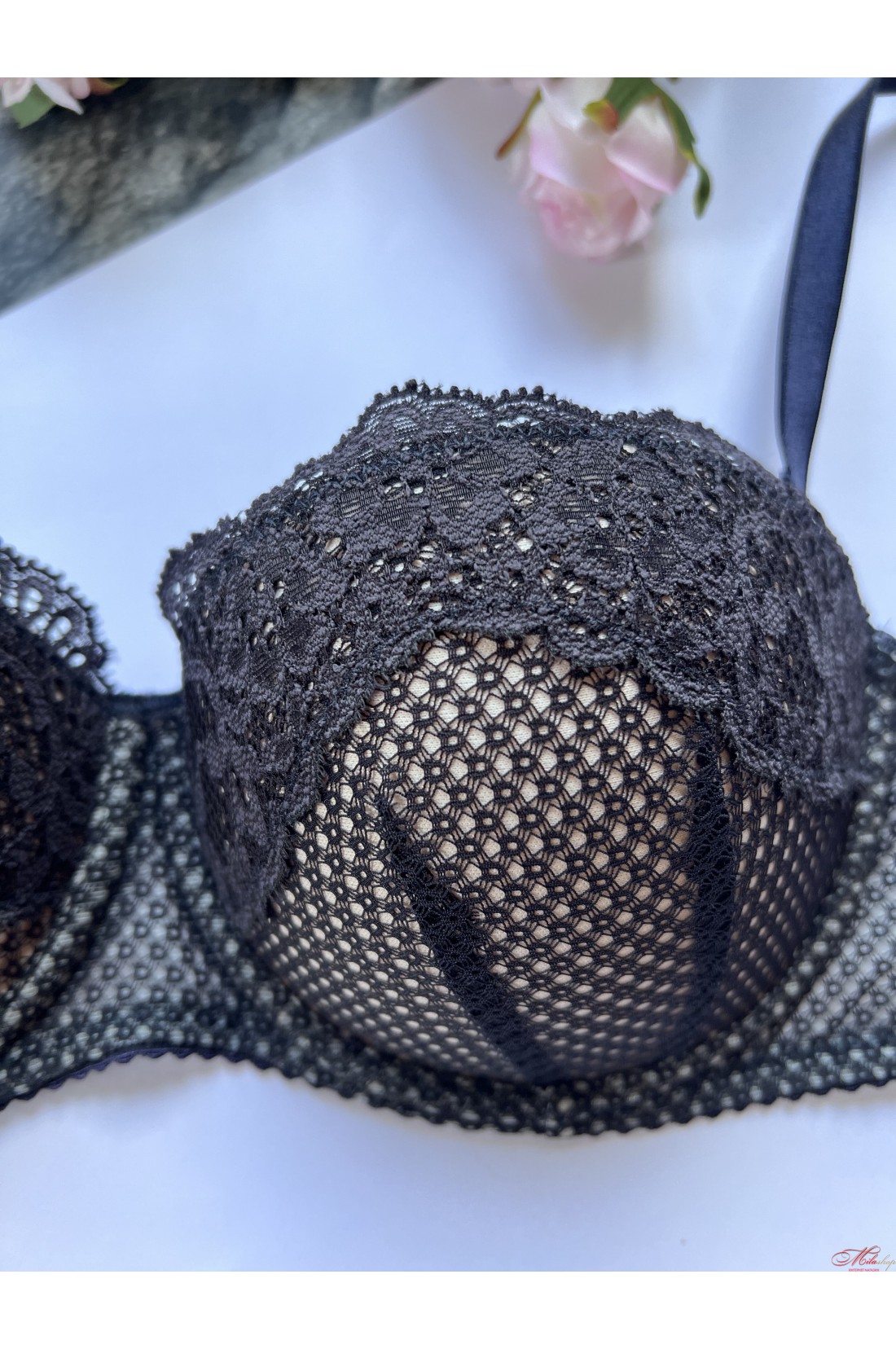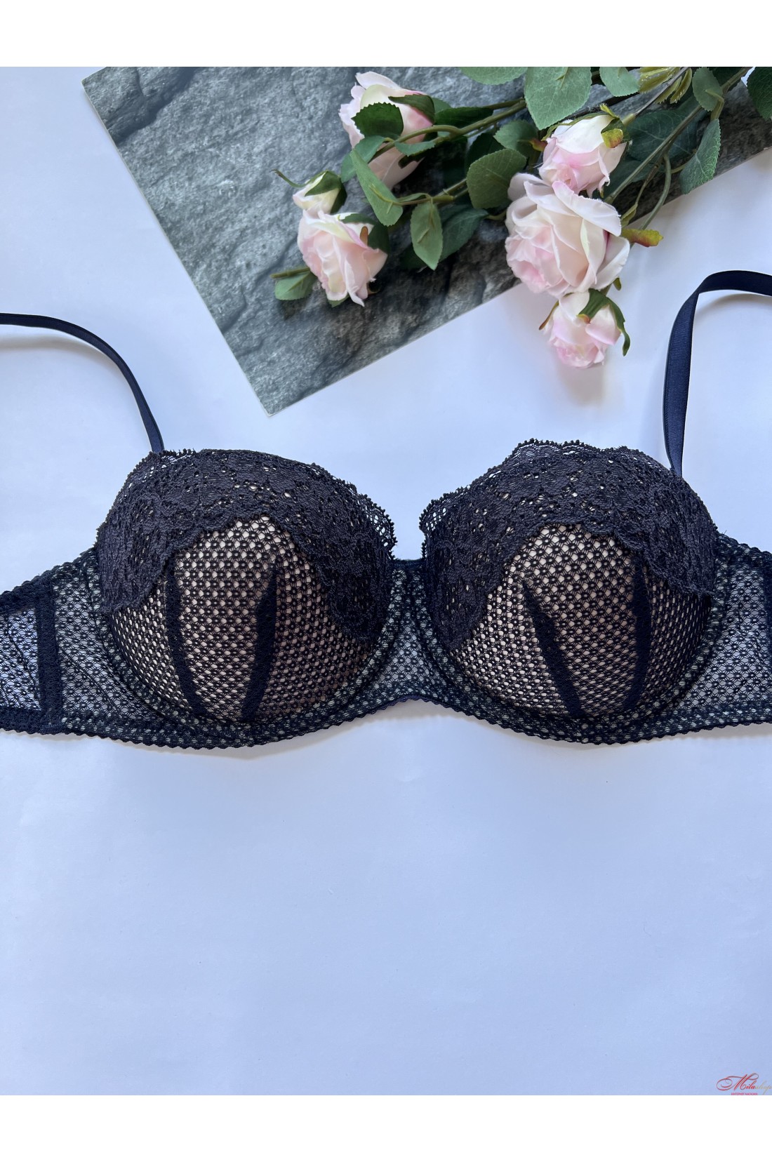 Шикарний бюстгальтер балконет виконаний з м'яких матеріалів, що дихають, з гарним мереживом. Чашки з пуш-ап. Бретели відстібаються, регулюються по довжині.