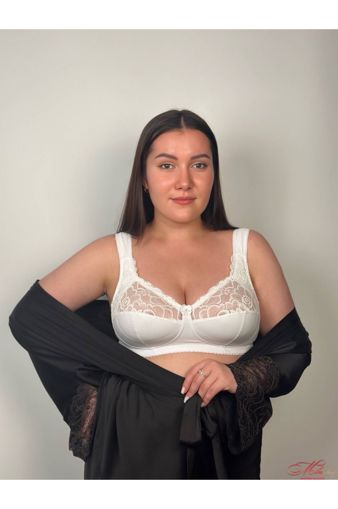 Бавовняний бюстгальтер великого розміру без каркасів від виробника Nana. Широкі комфортні ущільнені бретелі забезпечують максимальний комфорт в носінні, не врізаються в плечі навіть при дуже важких грудей. Верхня деталь чашок виконана з мереживного матеріалу, нижня - з бавовняного полотна. Горизонтальний Т-подібний шов рівномірно розподіляє груди за обсягом чашки. Внутрішня бічна коригуюча деталь виконана з тонкого поролону, дубльованого бавовною. Широка резинка в поясі забезпечує ефективну підтримку для пишного бюста. Виробник використовує високоякісну і надійну фурнітуру. Комфортний бюстгальтер прекрасно коригує і підтримує груди.
