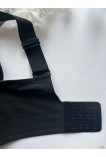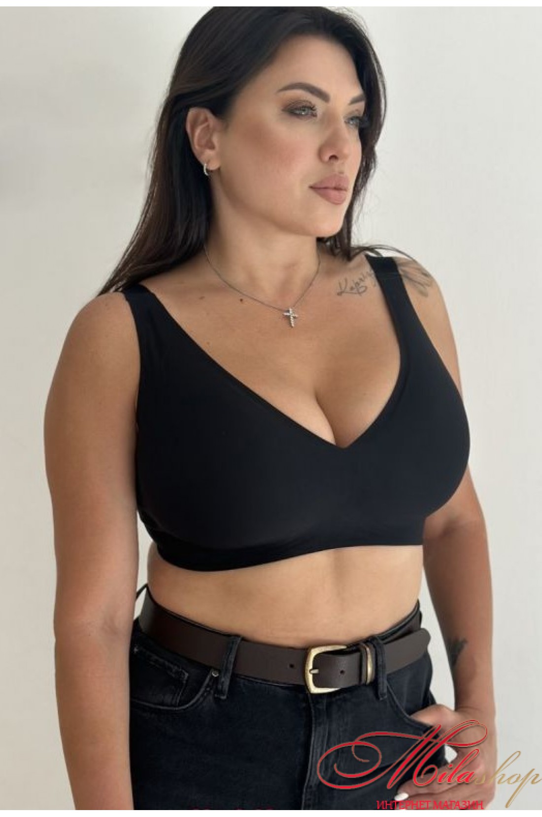 Безшовний бюстгальтер-топ із гладкого еластичного матеріалу з лазерною обробкою краю. Модель на широких регульованих бретелях, на спині застібка на гачки. Топ без каркасів з тонким поролоновим вкладишем у чашці та широким поясом. Дуже практична модель може використовуватися як базовий бюстик і як спортивний.