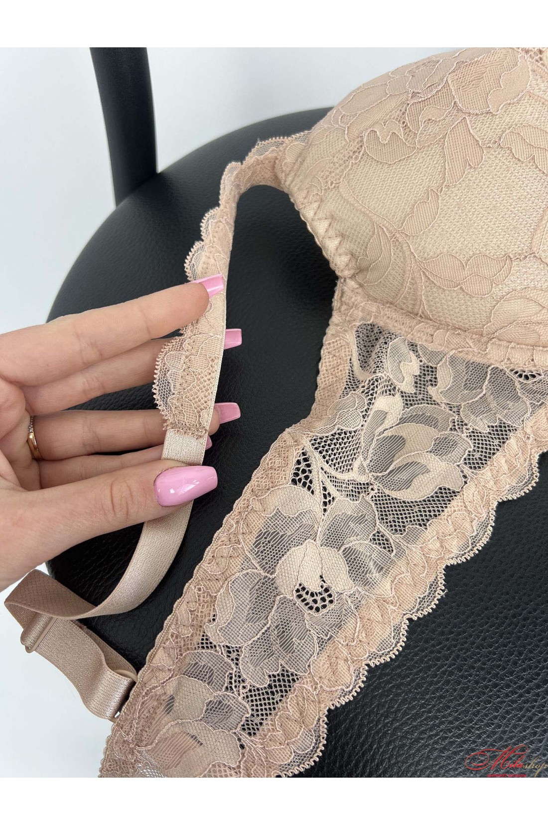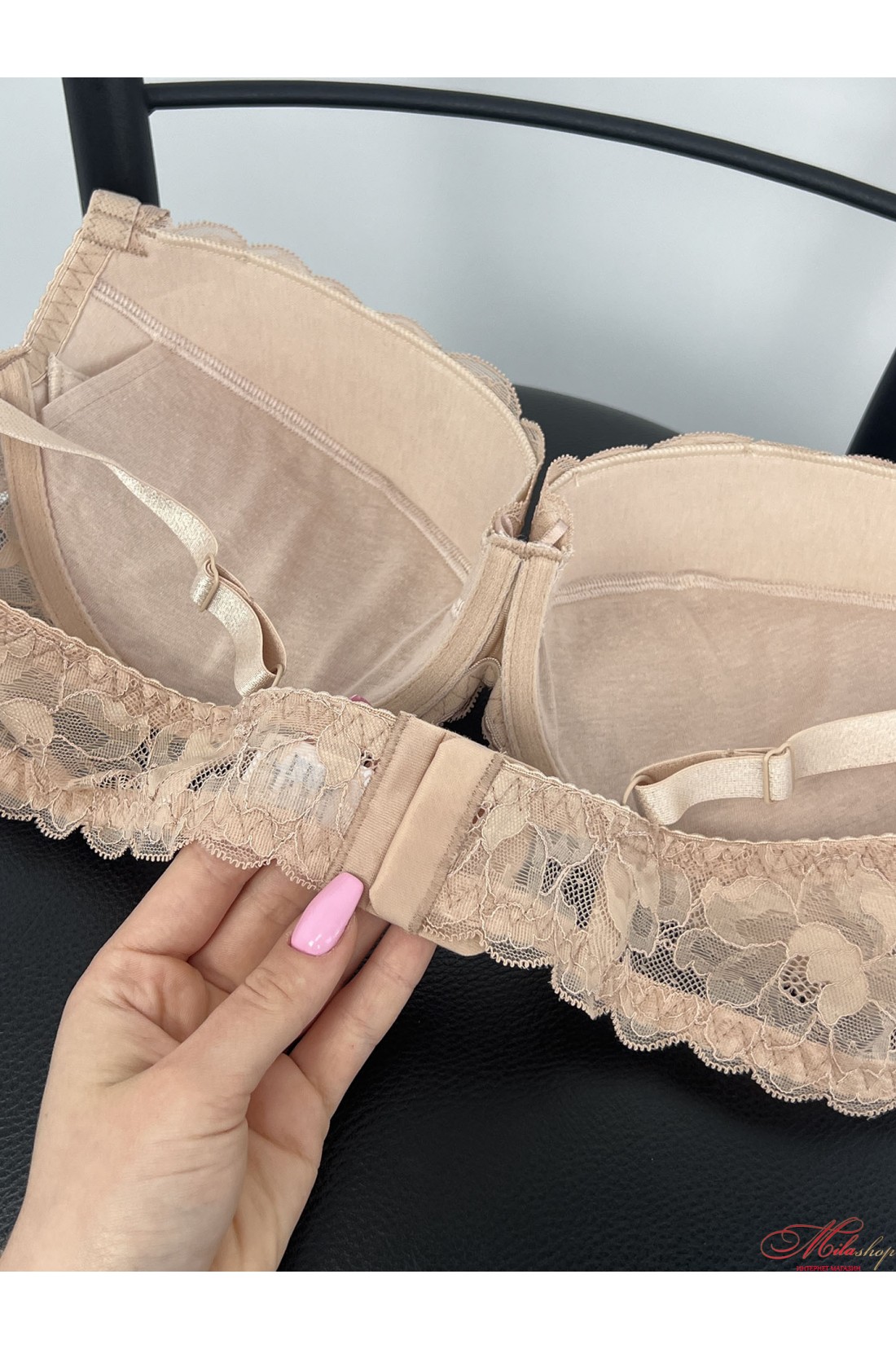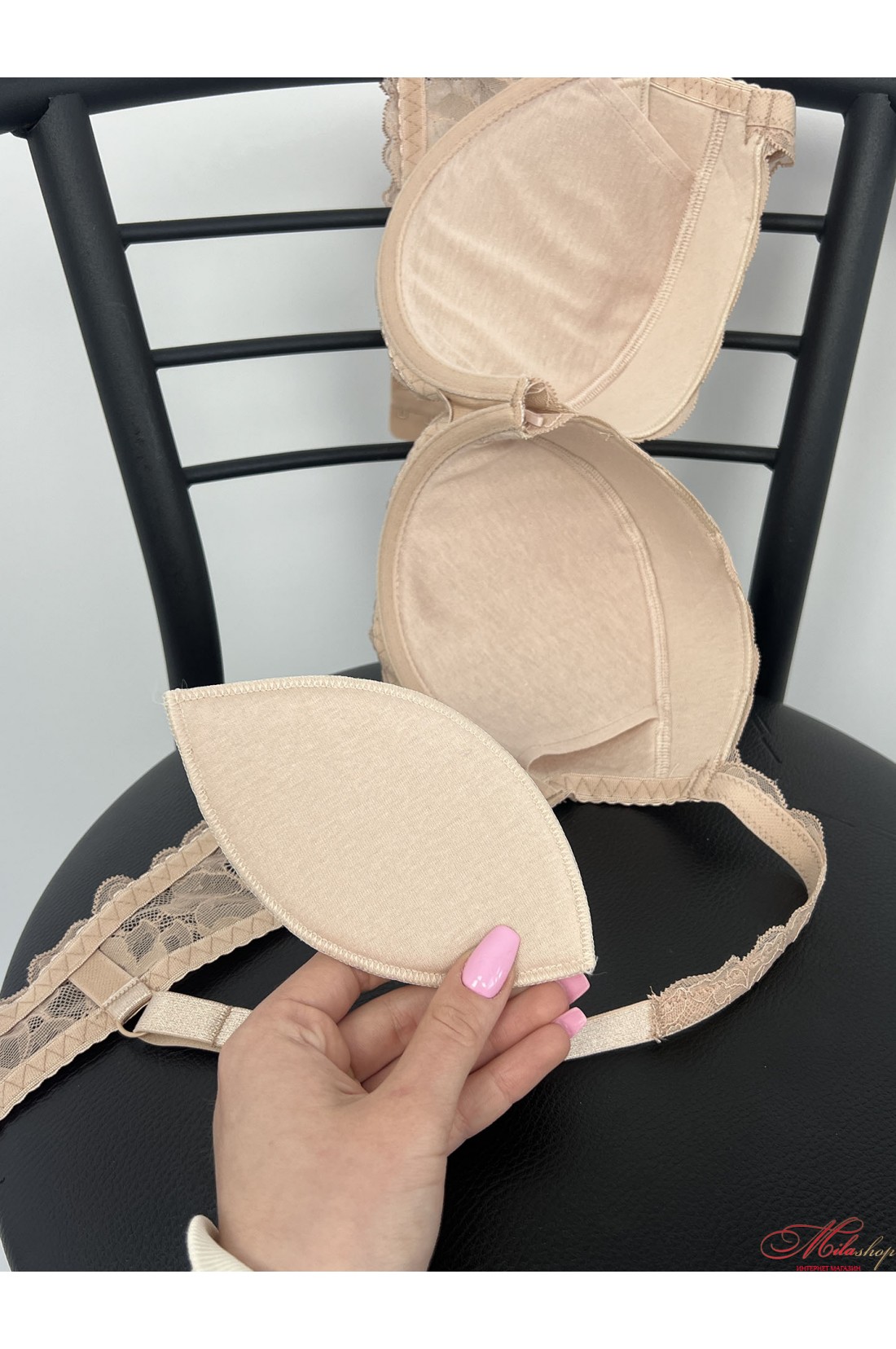 Гарний мереживний бюстгальтер зі знімним пуш-ап. Чашка всередині бавовняного полотна. Бретели декоровані мереживом, регулюються по довжині.