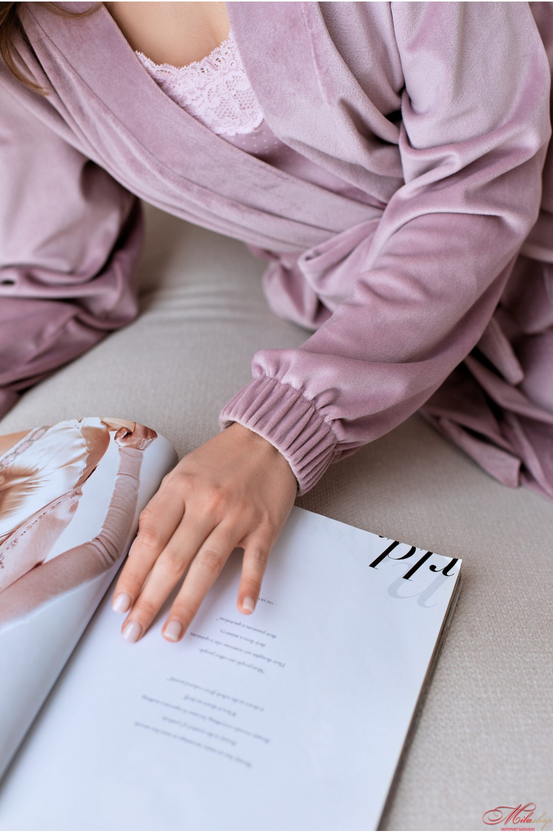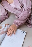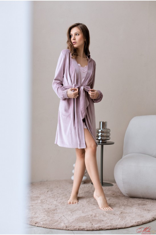 Велюровий халат з м'яким коротким ворсом із блиском, довгі рукави з манжетами-гумками. Крій на запах дозволяє регулювати посадку по фігурі, зав'язується на талії поясом, кишені в бічних швах.