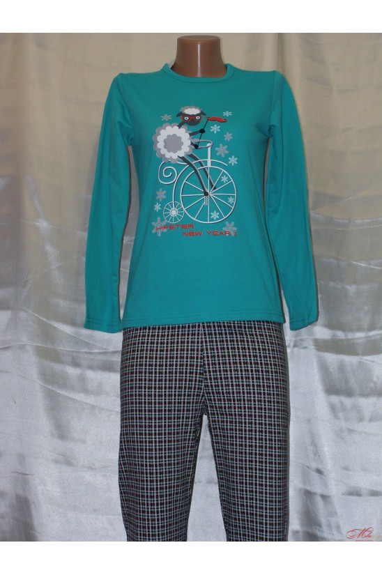Детская пижама с утеплением. Состоит из футболочки с длинным рукавом, которую украшает милая овечка (символ 2015 года), которая едет на велосипеде и клетчатых штанов. Благодаря высококачественным материалам Вашему ребенку будет не только тепло, но и комфортно!