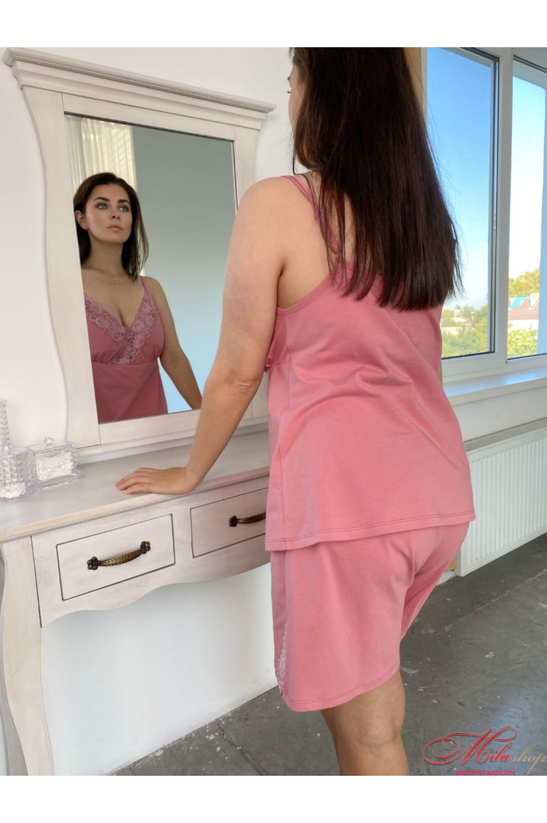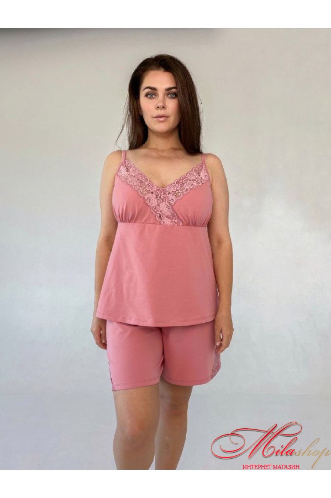Маєчка з підрізом під грудьми, декорована мереживом чудової якості. Бретелі регулюються. Шортики вільного крою із комфортною посадкою.