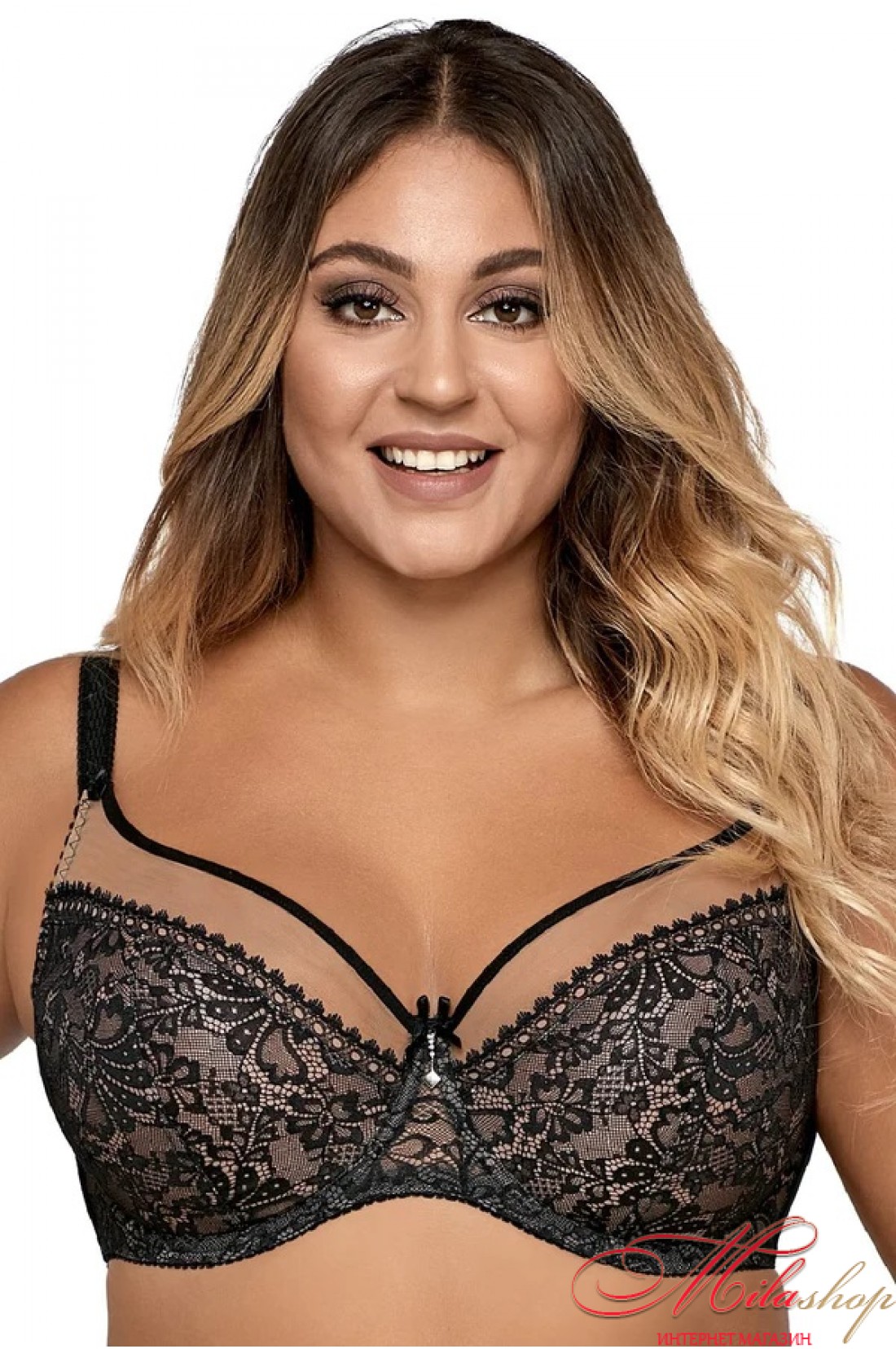 - Чудовий бюстгальтер - м'які мереживні чашки для підтримки пишних грудей, має горизонтальні та бічні кісточки для додаткової підтримки. Красиві по лінії декольте прозорі вставки з тюлю, між чашками прикрашені підвіскою. Застібка на спині: 3 гачки в 2 ряди. Широкі бретелі не відстібаються, регулюються довжиною.