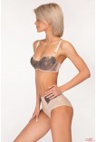 Роскошный комплект белья из бежевой микросетки и гладкой микрофибры. Бюстгальтер балконет с мягкими чашками поддерживает грудь и не добавляет объем, на косточках, бретели не отстегиваются, регулируются по длине. Трусики слип со средней линией талии, хлопковая ластовица. Комплект украшен цветочной вышивкой.