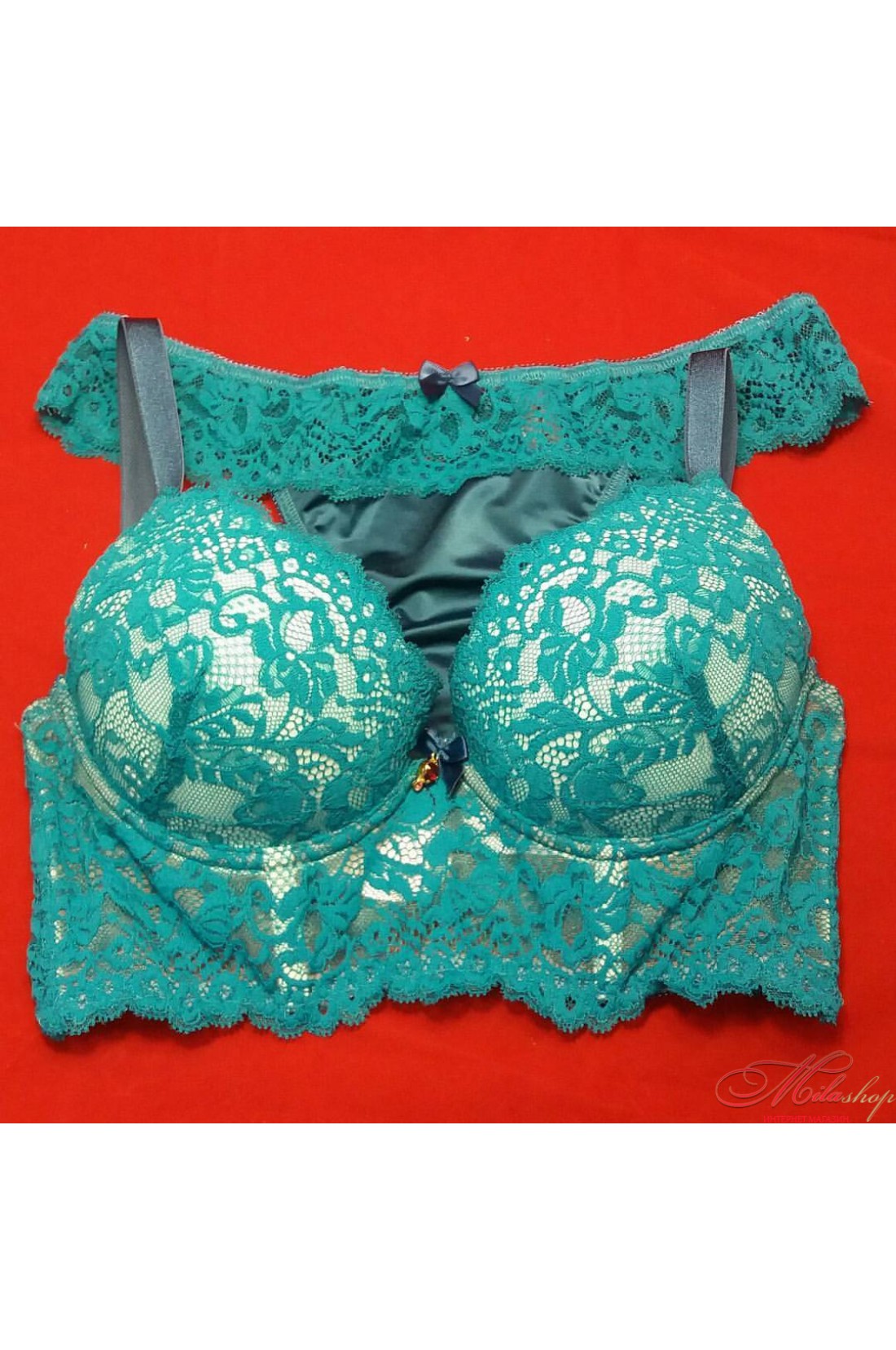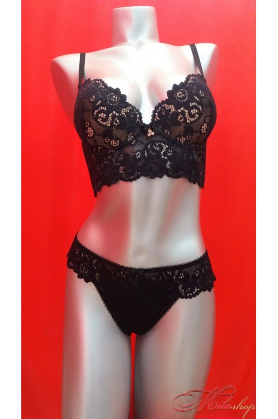 Комплект состоит из роскошного бюстгальтера с эффектом пуш-ап, из кружева и трусиков стринг с низкой линией талии.