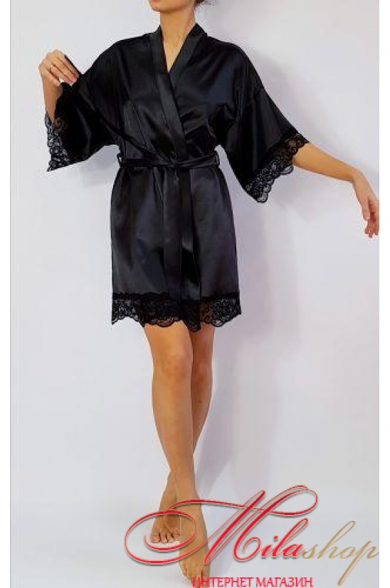 Изумительный шелковый халат. Выполнен из нежного блестящего шелка и матового кружева с цветочным принтом. Длина до колена, на запах под пояс. Рукав короткий, до локтя.