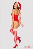 Новорічне боді-стрінг, поєднання червоного і білого, а також деталі комплекту додають новорічного настрою, боді без чашок і кісточок, підкреслює фігуру, без бретелей, відкриті плечі, руки і шия, чокер відстібається, виконує декоративну функцію і фіксує боді на грудях, ремінці чокера регулюються по довжині, є застібка на шиї, смугасті панчохи фіксуються на стегнах еластичною гумкою, в комплекті новорічна шапка з пухом і помпоном.