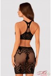 Сексуальний комплект з ажурної сітки, тканина еластична, тягнеться у всіх напрямках та адаптується до форми тіла, підкреслює фігуру, топ на тонких бретелях, без чашок та кісточок, облягаюча прозора спідниця-олівець, середня лінія талії. Топ і спідниця комплекту виконані з еластичної сітчастої тканини, що добре тягнеться, з малюнком з більш густої сітки. Геометричні візерунки підкреслюють витончені лінії фігури, лише злегка прикриваючи інтимні зони тіла. Тонкі шлейки закритого топа ззаду мають вигляд стильної борцовки, водночас залишаючись тією самою спокусливою спідньою білизною. Вузька спідниця до середини стегна сексуально обтягує сідниці, неоднозначно натякаючи, що під сітчастим подолом немає трусиків.