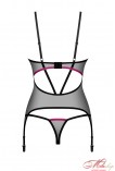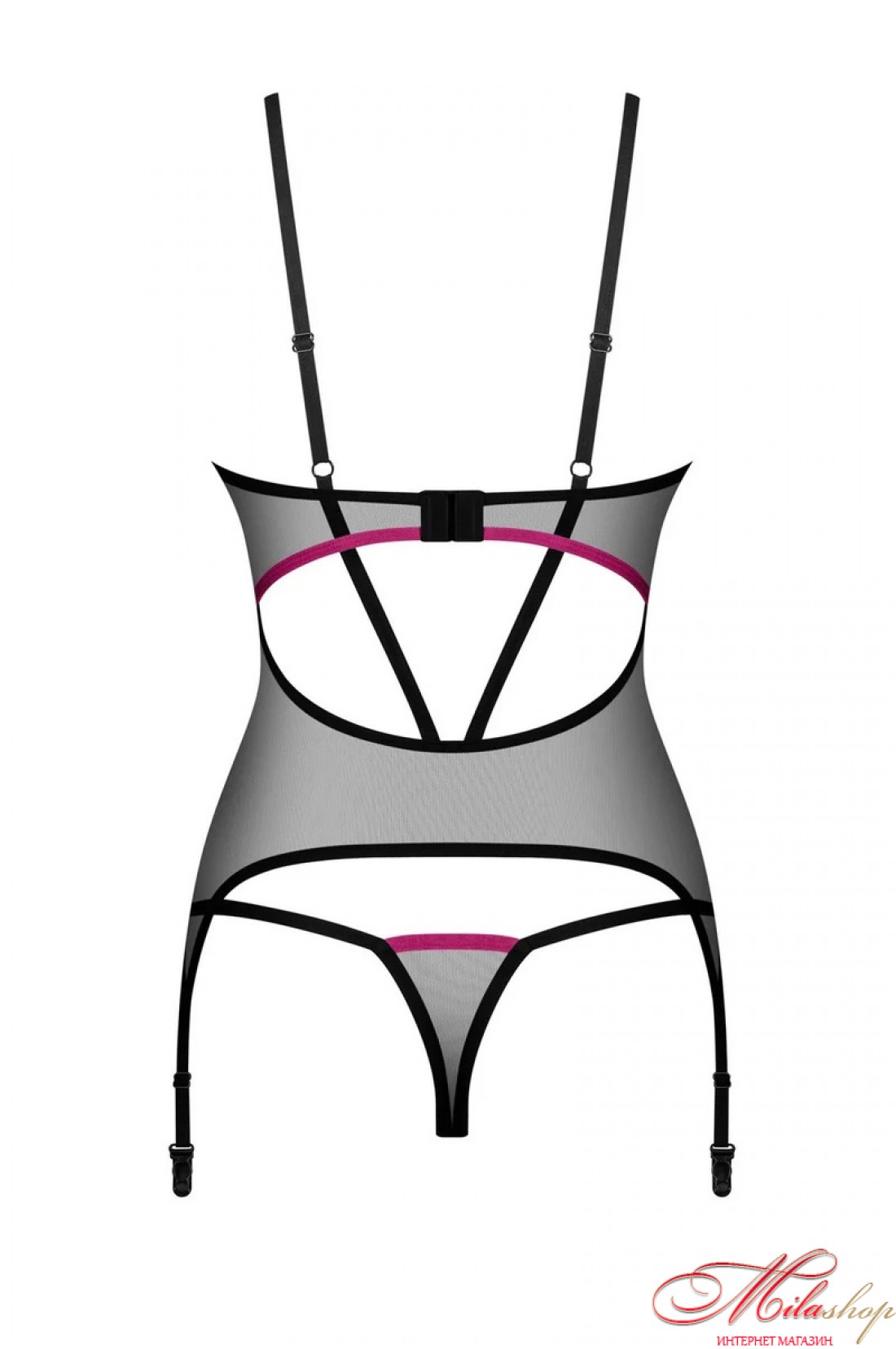 Корсет з прозорої мікросітки, м'які чашки на кісточках підтримують груди і підкреслюють їх природну форму, ліф застібається на спині гачками, плечові бретелі регулюються по довжині, не відстібаються, пажі для панчіх не відстібаються, регулюються по довжині, трусики стрінги. Панчохи до комплекту не входять. Одна з яскравих особливостей цього набору — декор із тонких пурпурових стрічок в зоні декольте, на спинці та задній частині трусиків. Ці деталі гармонійно доповнюють основний матеріал — чорну шовковисту мікросітку, оброблену матовим кантом у тон. Корсет характеризується відсутністю кісточок із боків: тканина м’яко облягає тіло, підкреслюючи його контури. Кісточки є лише в чашках ліфа. З боків модель закриває стегна, залишаючи відкритими сідниці. По обидві сторони корсет має кріплення для панчіх із м’якими силіконовими вставками.