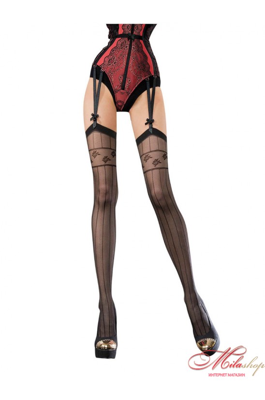 Фантазийные чулочки под пояс. Благодаря вертикальным полосам зрительно удлинняют и стройнят ножки. Верхняя часть украшена цветочным узором.