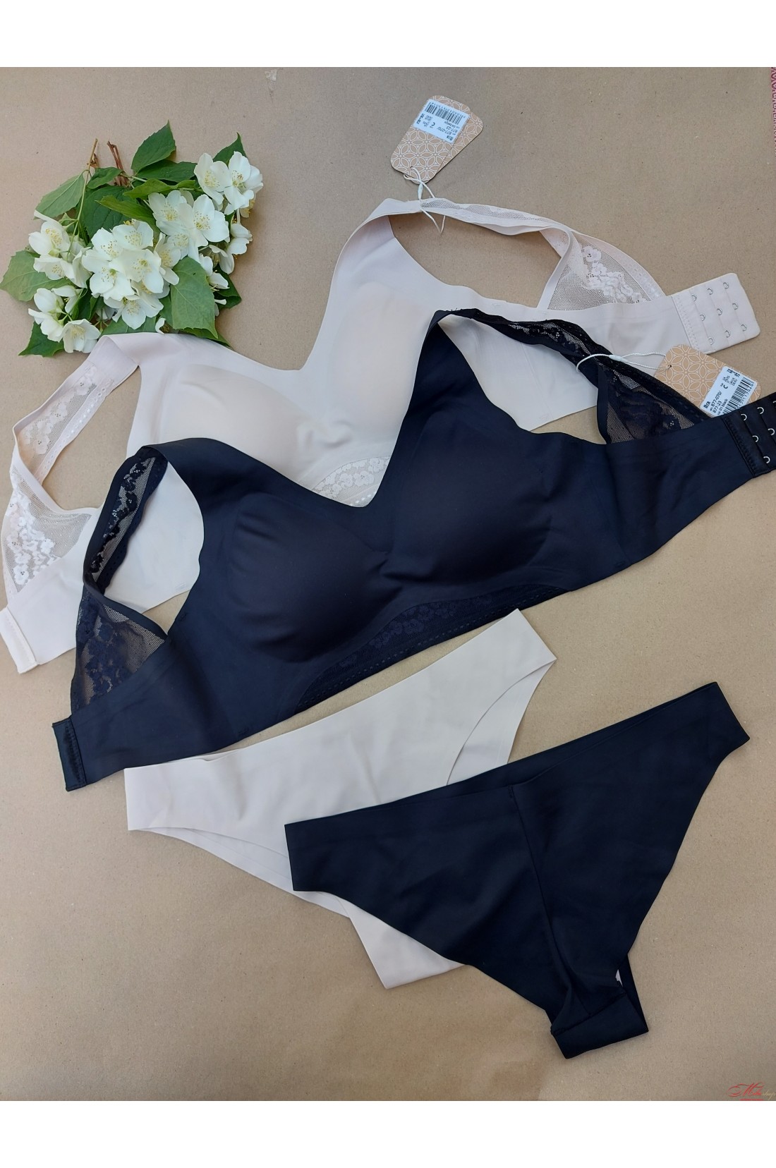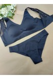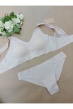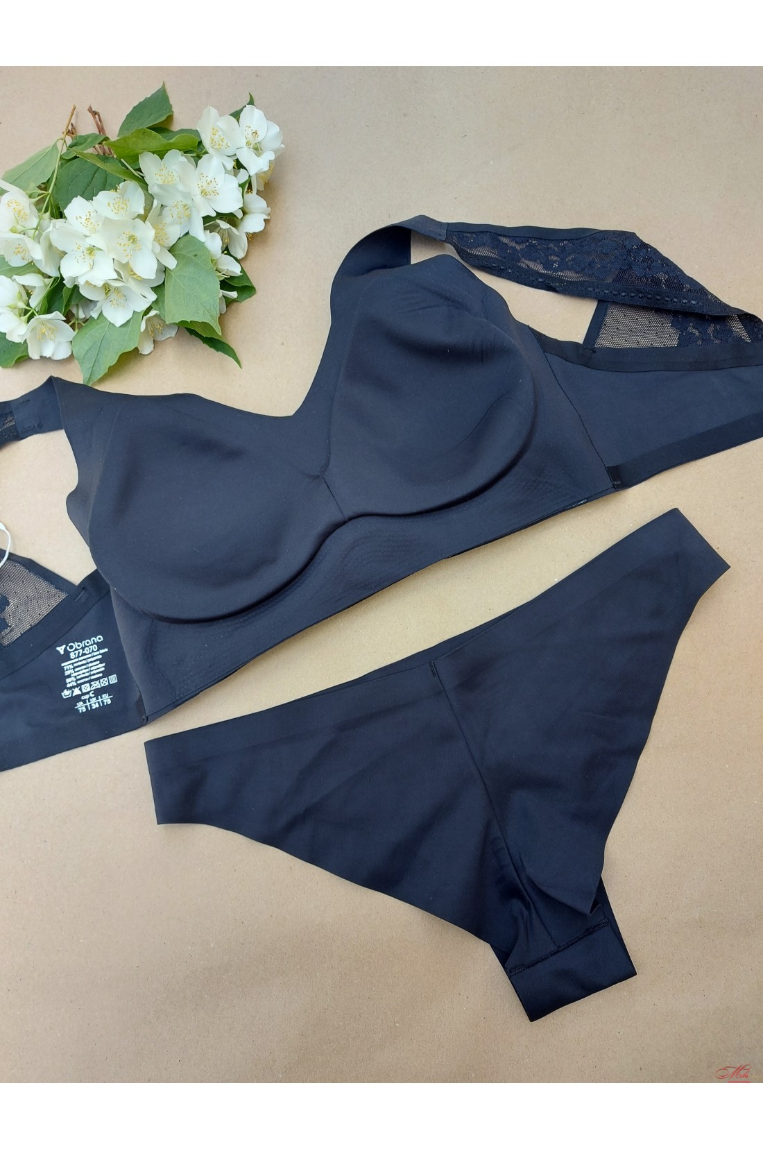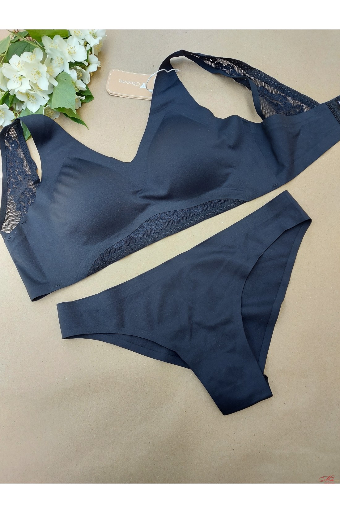 Безшовний комплект складається з бюстгальтера та трусиків. Бюстгальтер – чашка без пуш-ап зі знімними поролоновими вкладишами, конструкція без каркасів. Широка незнімна бретель прикрашена гарним мереживом. Безшовні трусики-бразиліана з м'якої мікрофібри із лазерною обробкою краю. Задня деталь із середнім швом, що забезпечує гарну посадку. Розміри – 75B/C, 80B/C, 85B/C.