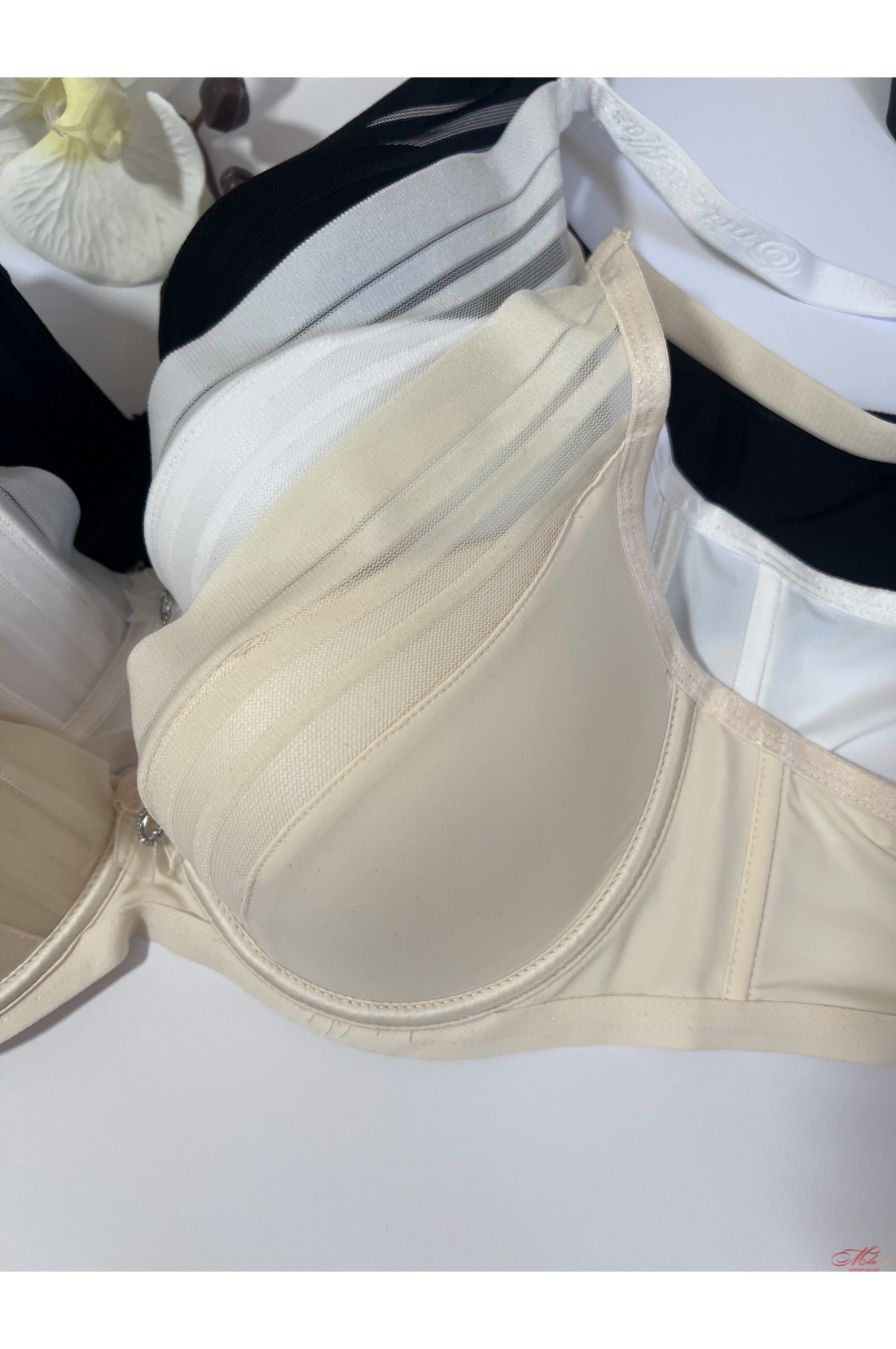 Бюстгальтер з поролону, чашка прикрашена мікросіточкою, незнімна бретель. Гарно тримає груди, чашка з невеликим пуш-ап. Відмінний варіант на будь-яку пору року.